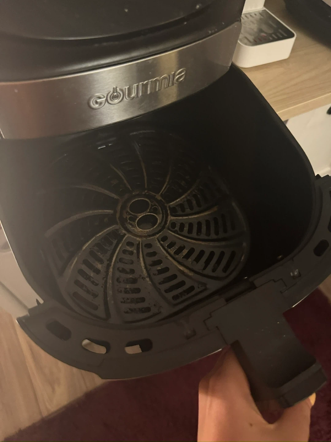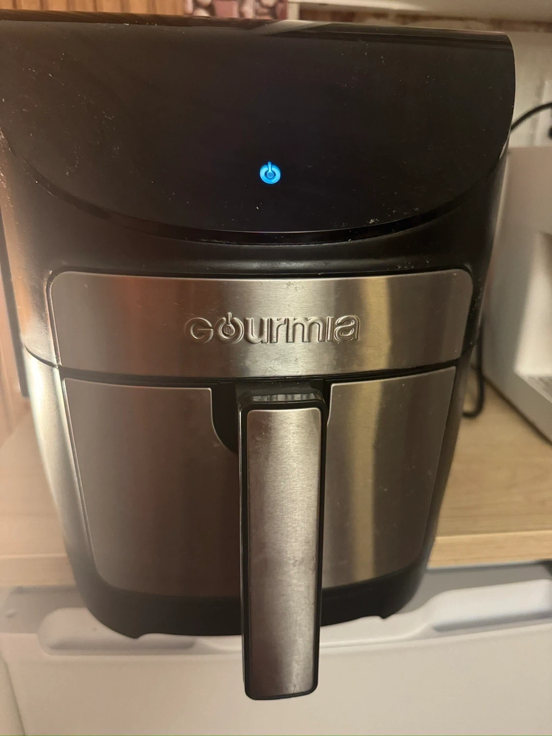 Gourmia air fryer with preheat function. It has various cooking presets for fries, fish, poultry, bacon, steak, and shrimp. Temperature and time controls are adjustable. The basket is removable for easy cleaning. It's great for quick meals and snacks!