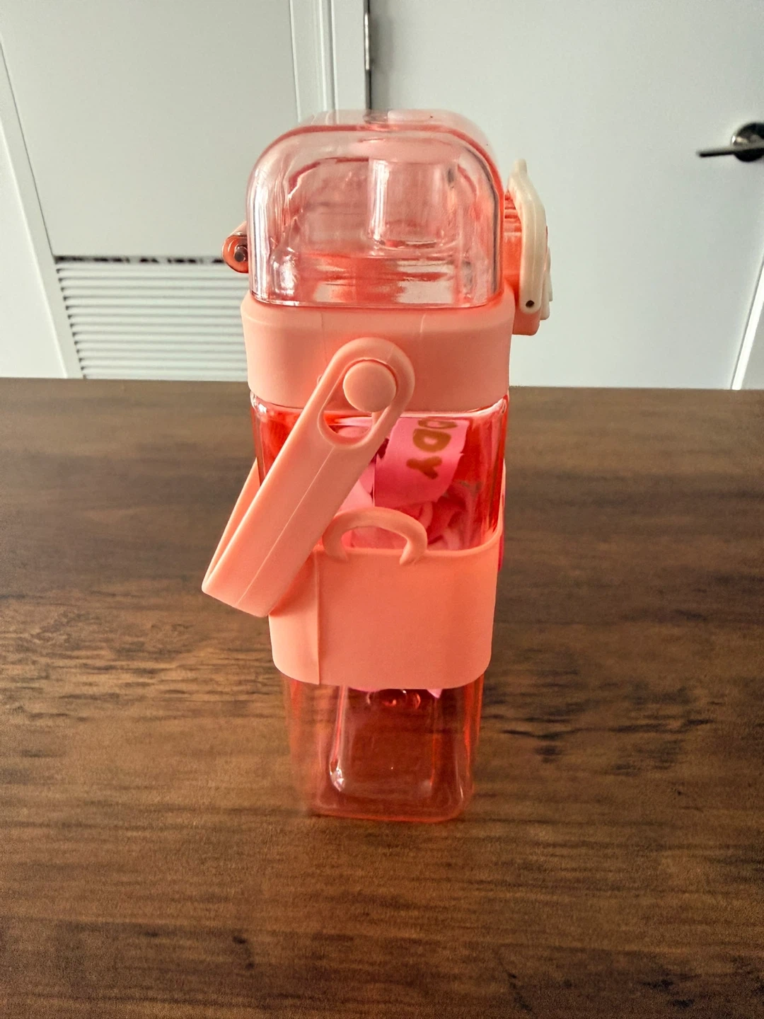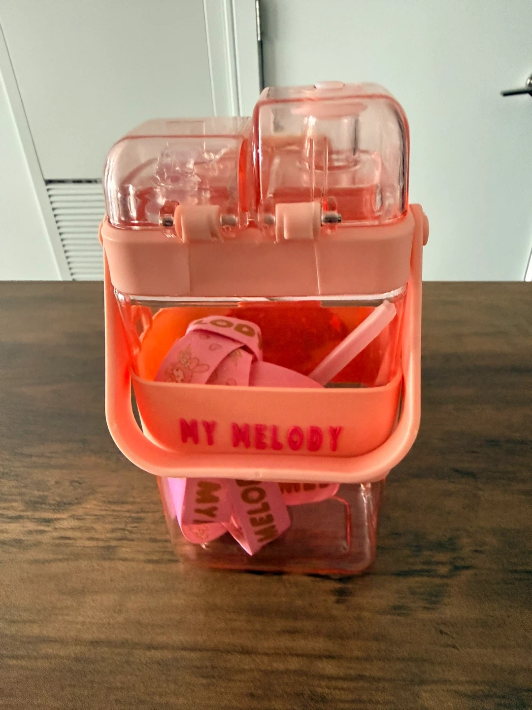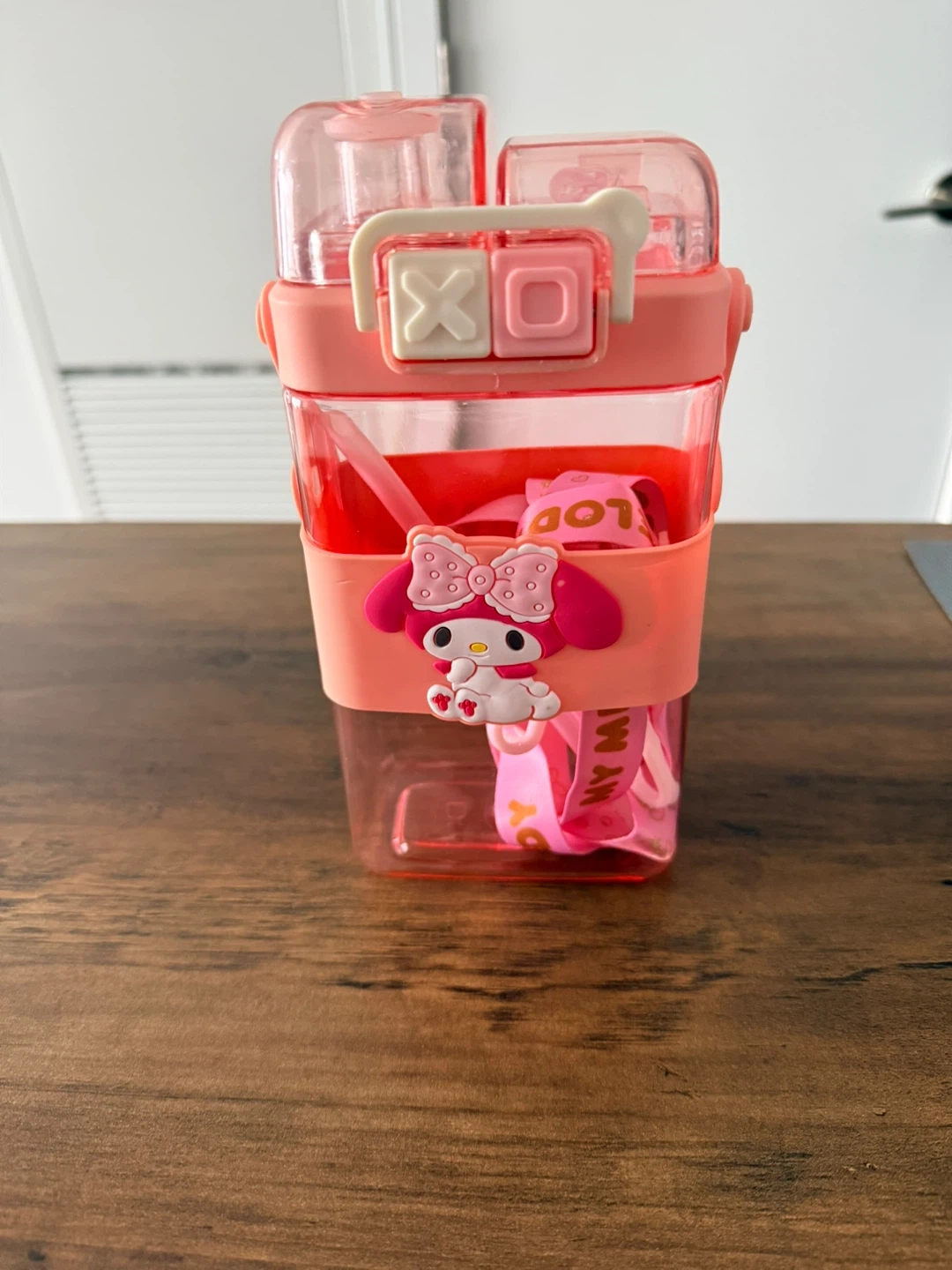 Adorable pink water bottle featuring My Melody. It has a convenient straw and a cute character charm. Perfect for fans of Sanrio characters!