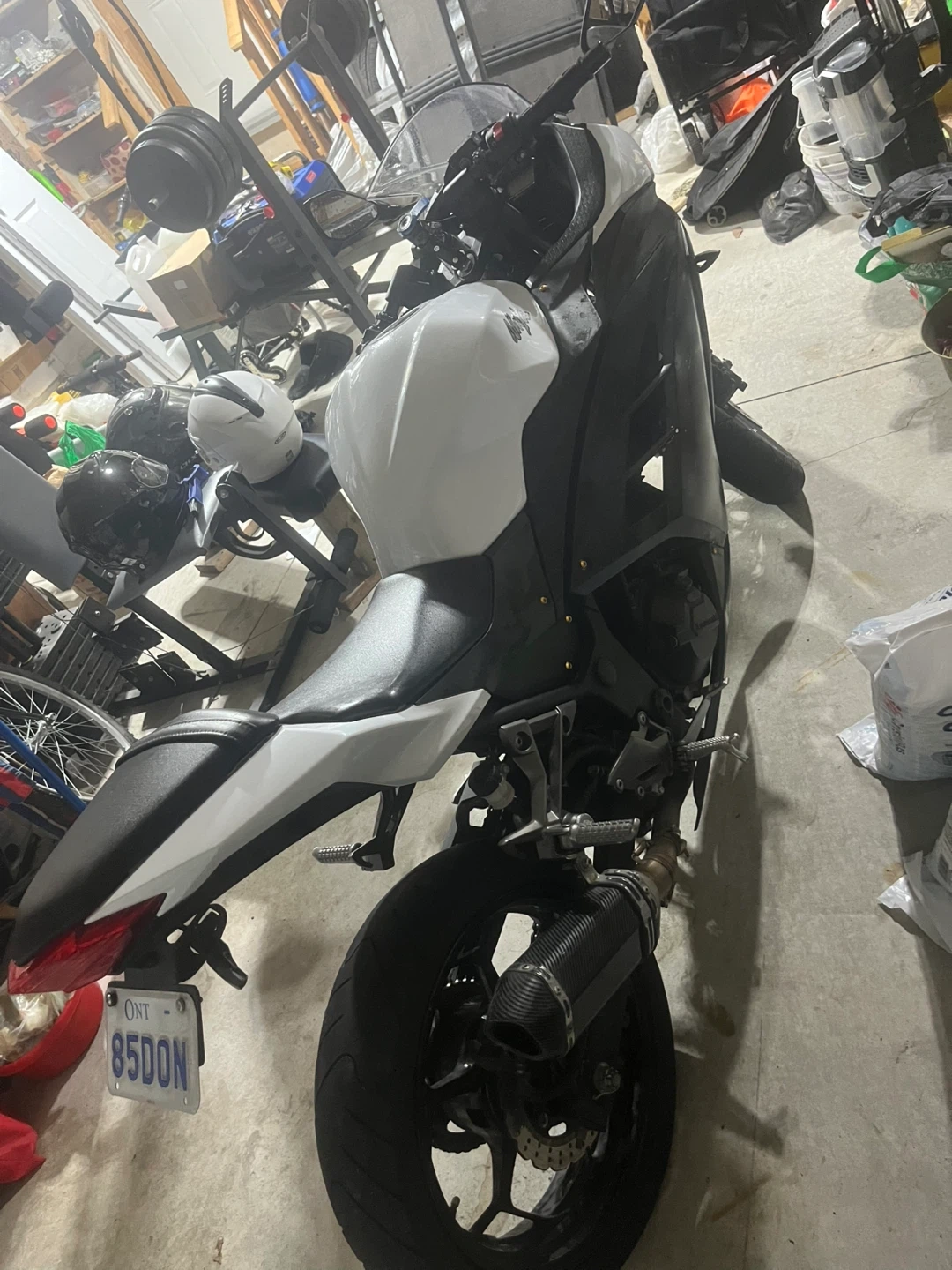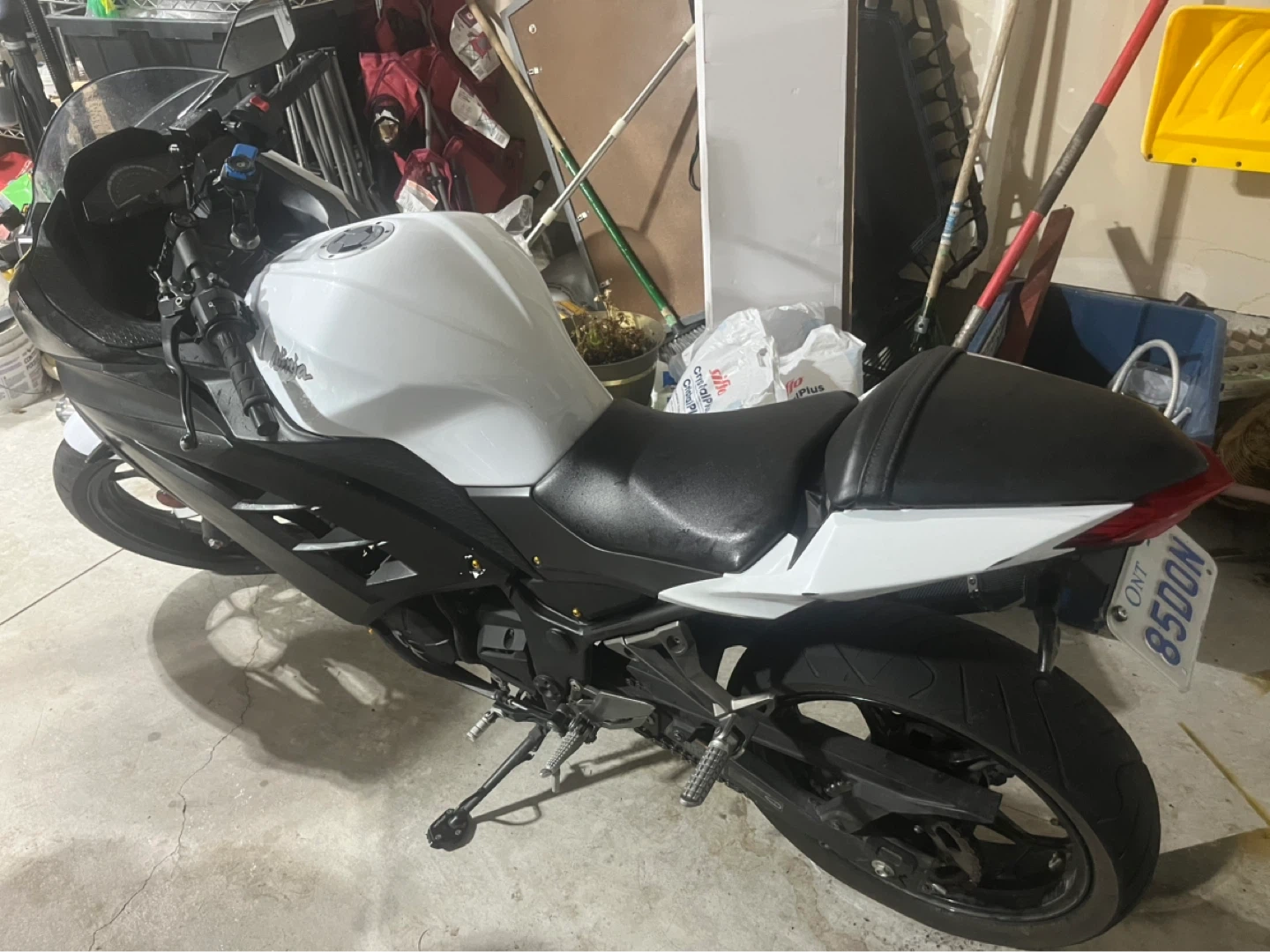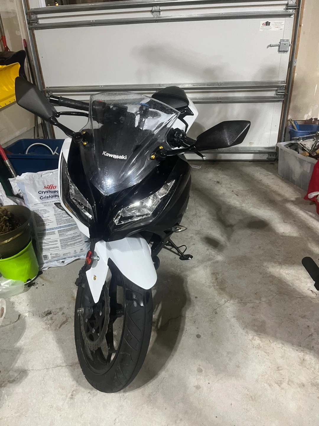 White and black Kawasaki Ninja sportbike with low mileage. Features a digital display and ABS braking system. It's a great starter bike for new riders!