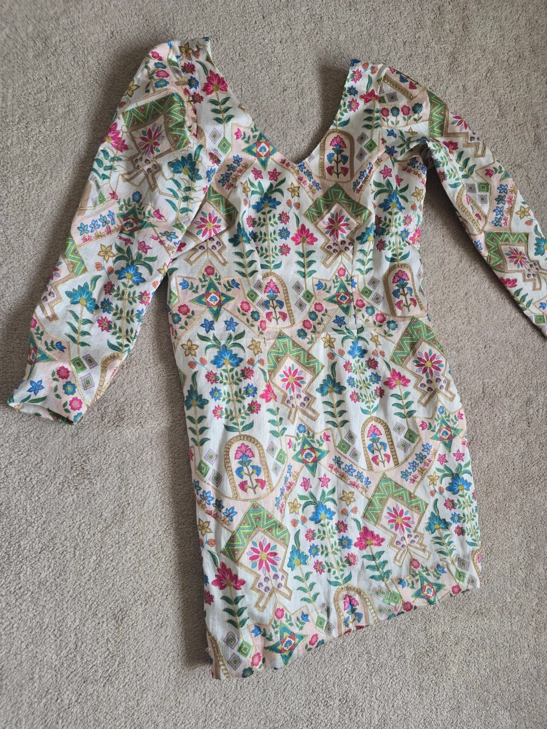 This is a lovely women's short shirt with a vibrant floral print. It features long sleeves and a V-neck design. The fabric is lightweight and comfortable.