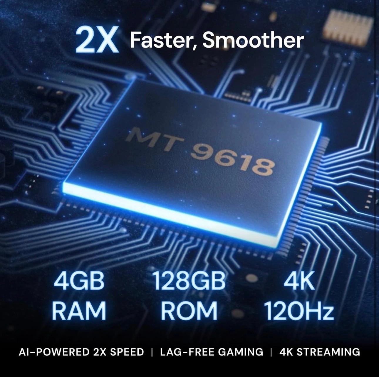 Speed and Power Like Never Before - Experience unmatched speed with the AI-9618 chipset, 4GB RAM/ 128GB ROM—delivering over double the power of other typical 2GB/32GB projectors, ensuring lightning-fast operation, smoother multitasking, and effortless 4K streaming. Its advanced architecture handles intensive tasks like gaming, AI-driven optimizations, and large content files without breaking a sweat, while others lag behind.