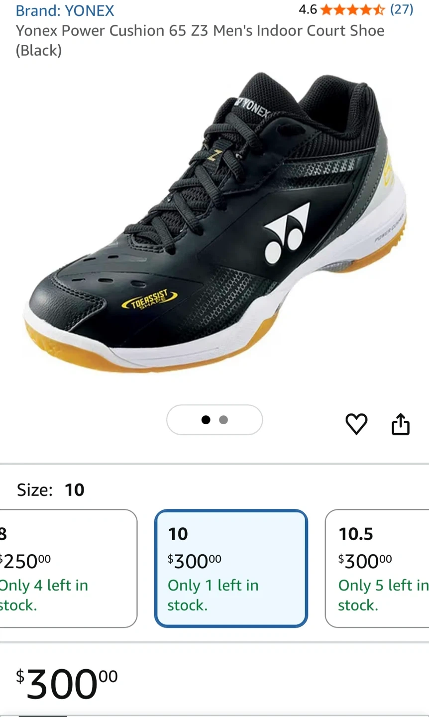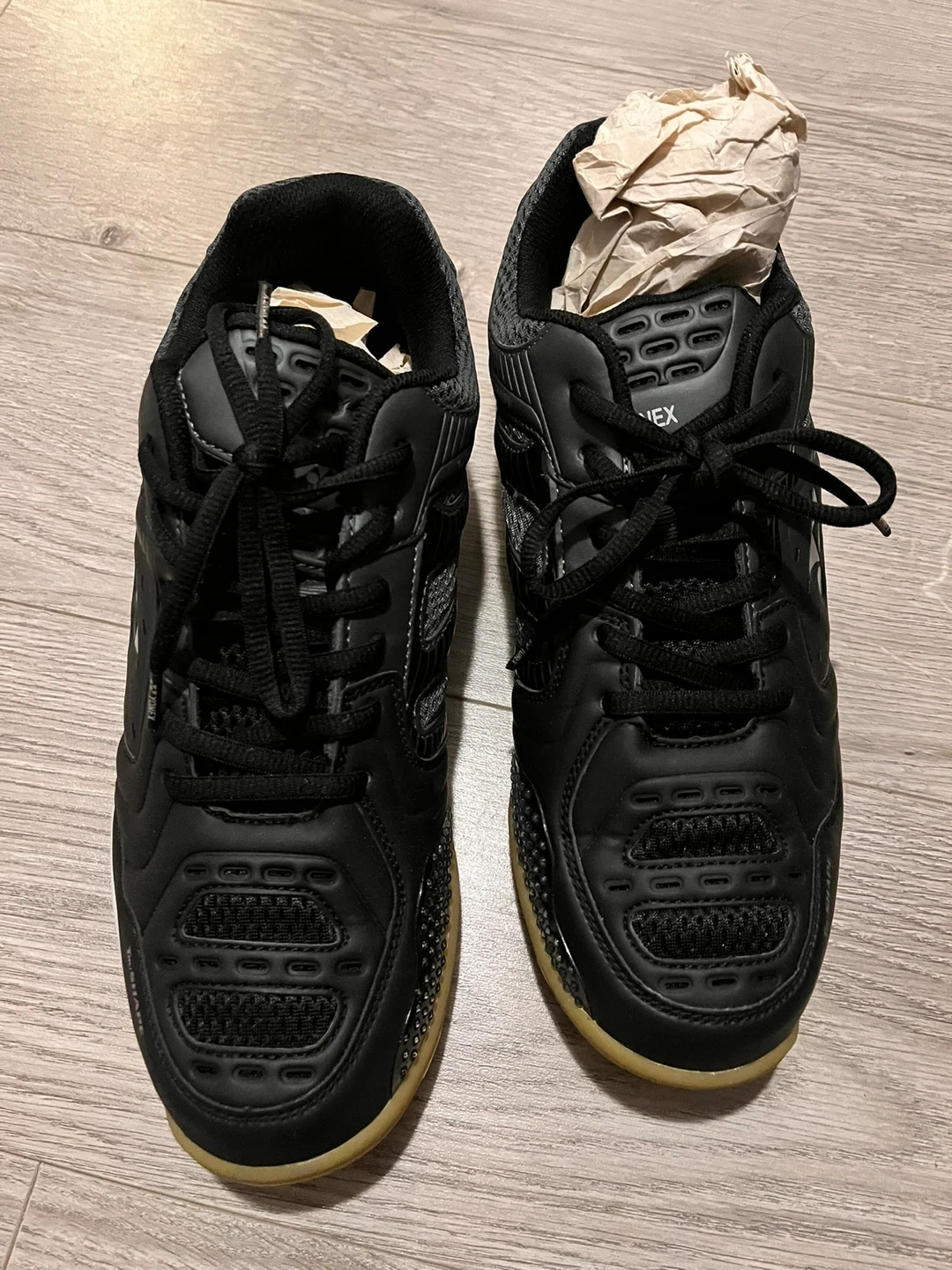 These are Yonex men indoor court shoes. They're black and size 10. The shoes feature a rubber sole for grip. They're great for badminton or other indoor court sports!