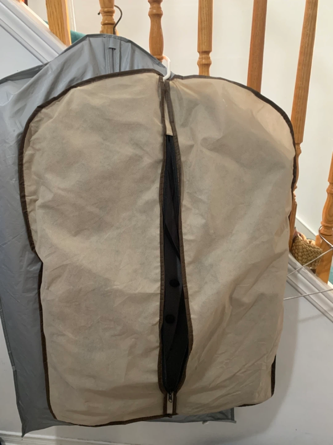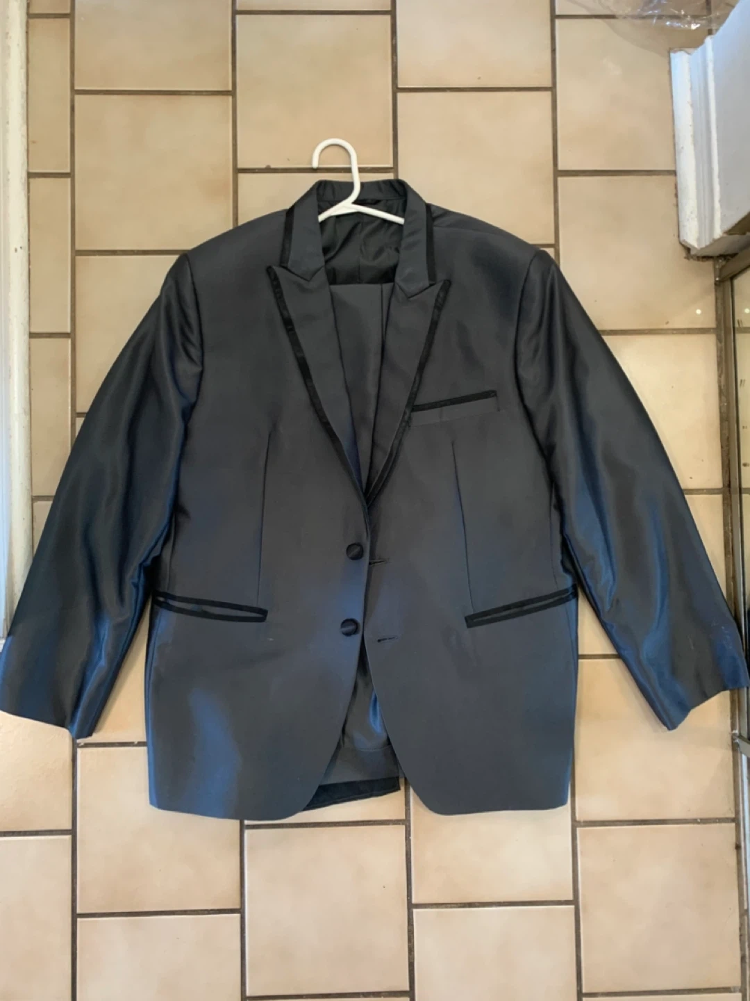 Two-piece men's suit in a dark grey colour. It features black satin lapels and trim. Includes a matching jacket and trousers. Comes with a garment bag.