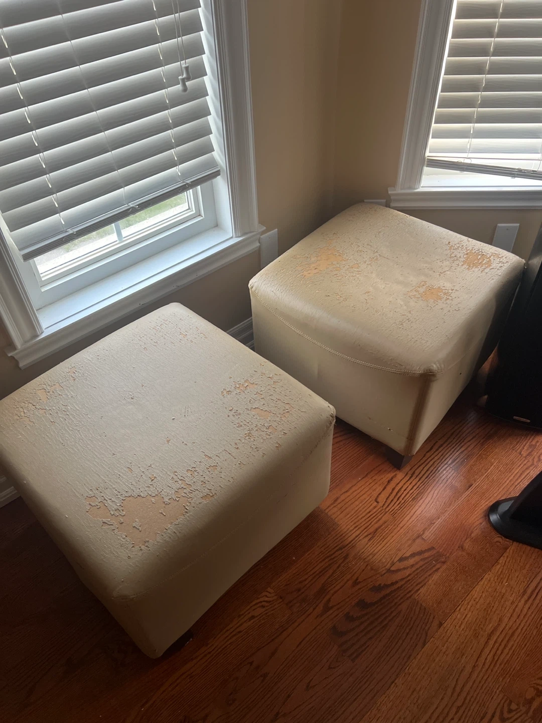 Two square ottomans in a beige colour. The upholstery shows significant wear and peeling. They're perfect for a footrest or extra seating.