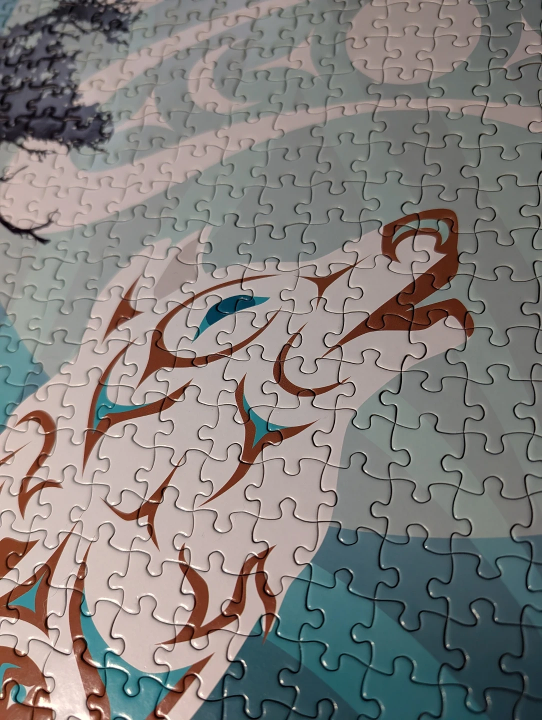 This Native Northwest jigsaw puzzle features a "Howling Wolf" design by Darrell Thorne, Coast Salish artist. It's made from recycled board and printed with vegetable-based ink. Suggested for ages 12 years and up.