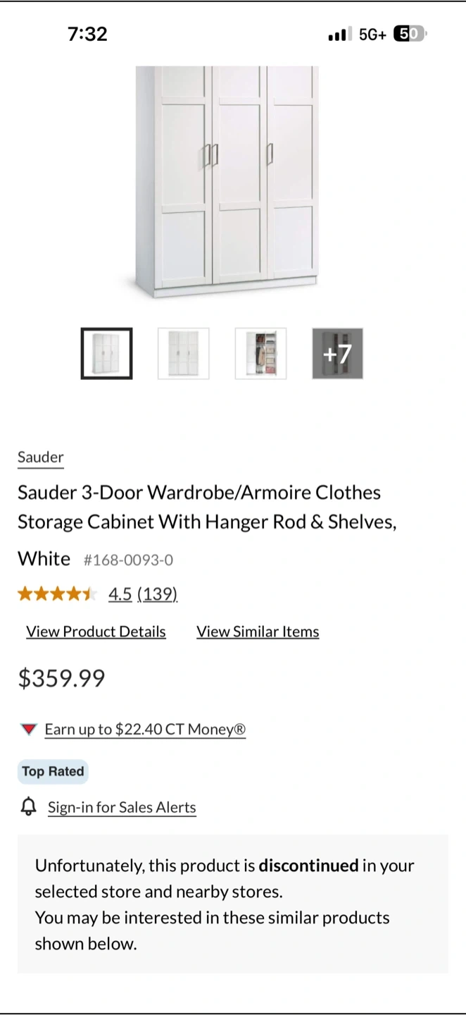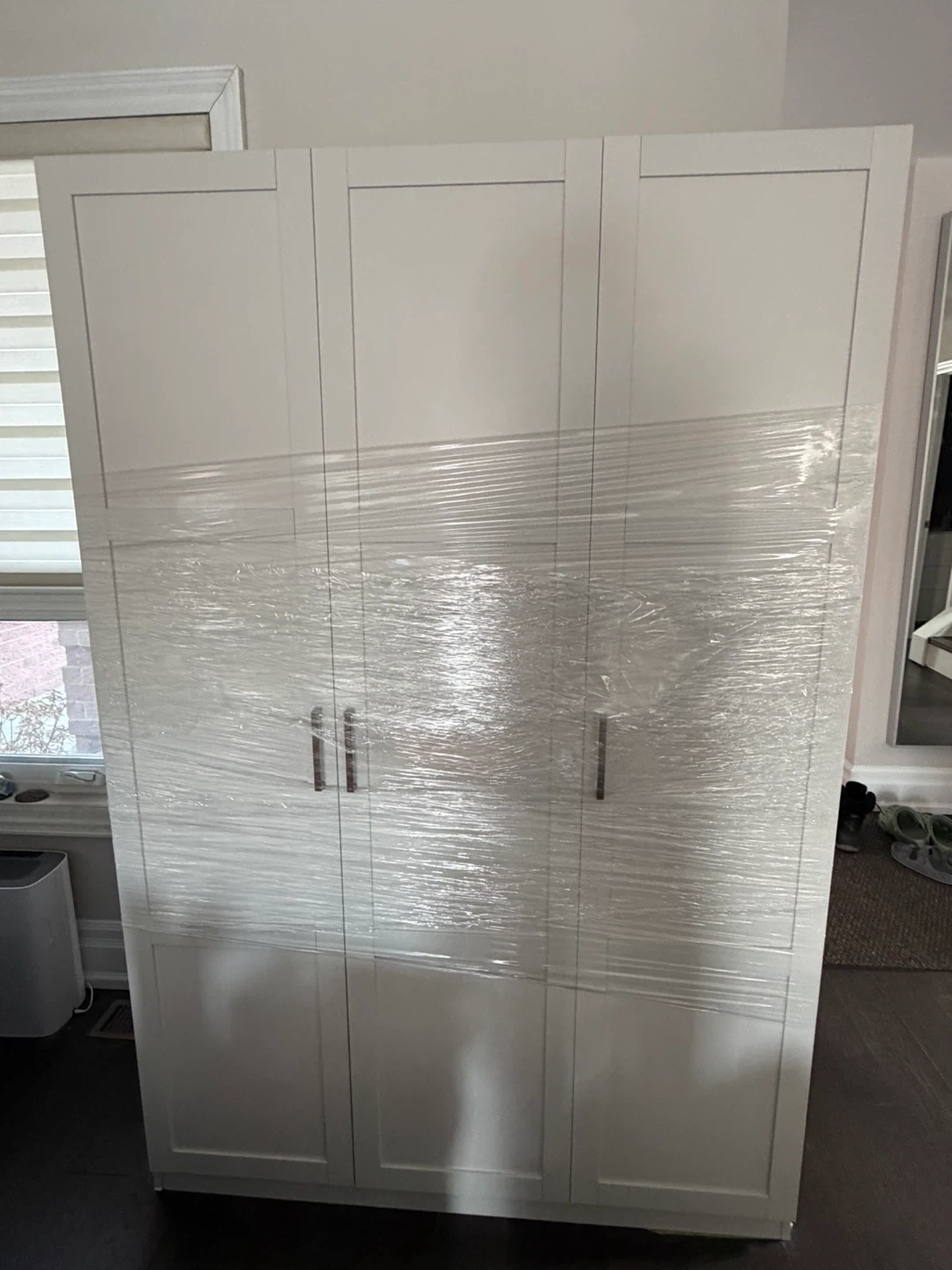 White Sauder 3-door wardrobe/armoire for clothes storage. It has a hanger rod and shelves. This cabinet is in good condition and wrapped for moving.