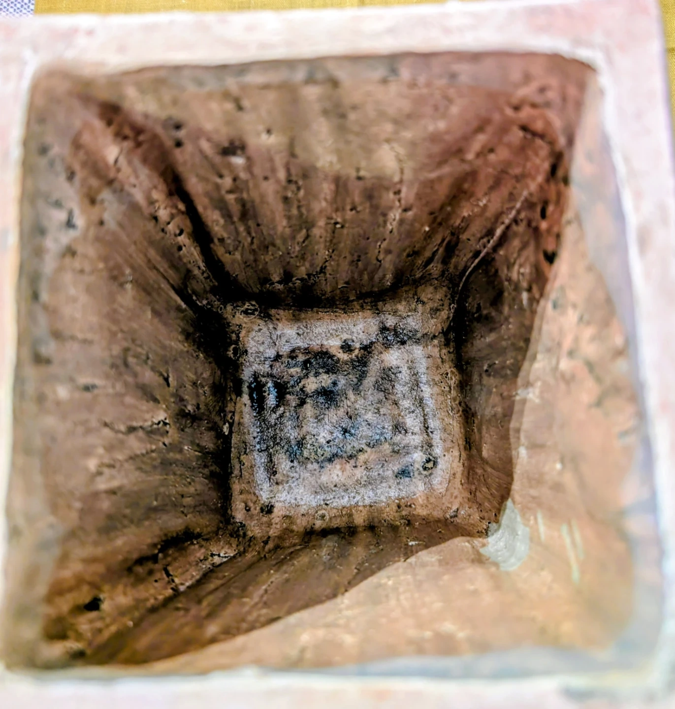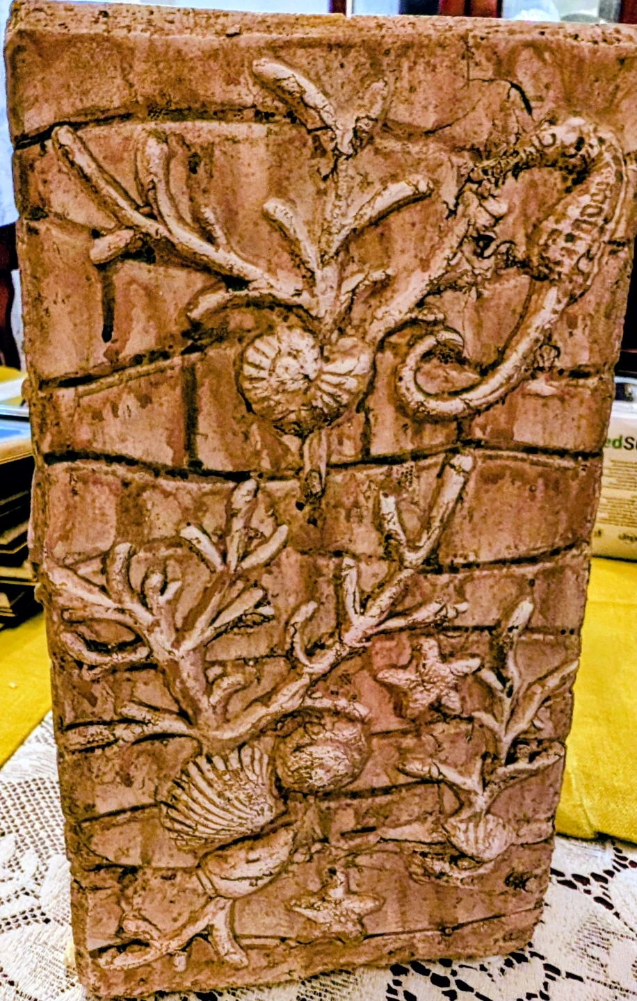 This ceramic vase features a rustic brick texture with embossed marine life, including seashells and coral. It's a square-shaped planter with a weathered finish. Interior dimensions are approximately 5x5 inches.