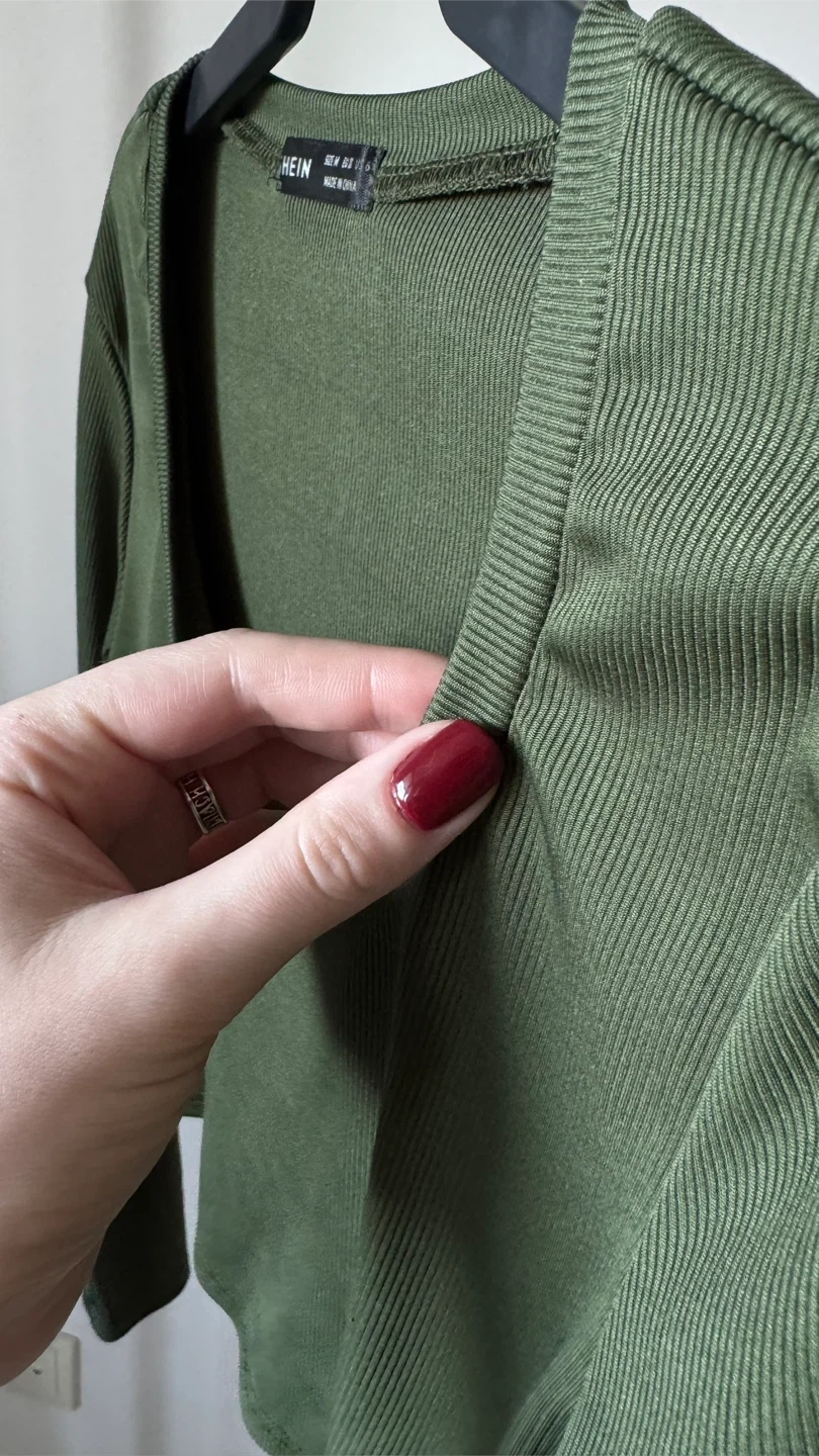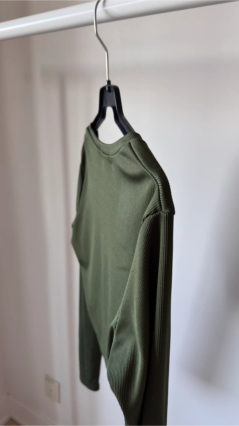 This is a SHEIN olive green ribbed long-sleeve cropped top. It features a scoop neckline. Made from a stretchy knit fabric for a comfy fit.