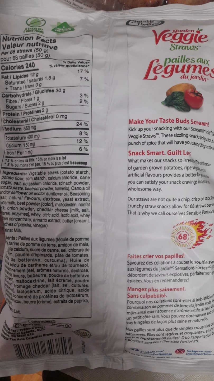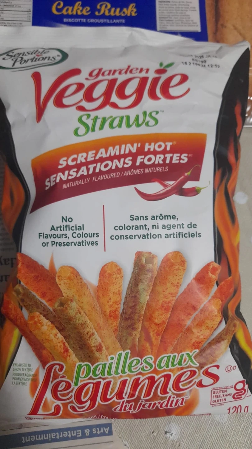Enjoy Sensible Portions Garden Veggie Straws in Screamin' Hot flavour. These snacks are naturally flavoured with no artificial colours, preservatives, or flavours. They're made with a blend of vegetable flours and come in a 120g bag. A tasty crunch without the guilt!