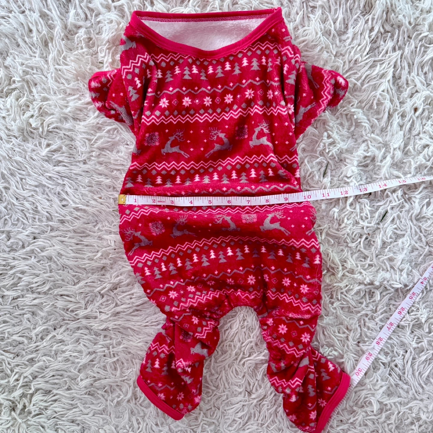 Keep your furry friend cozy this holiday season with these adorable red pet pajamas! They feature a festive pattern with reindeer and Christmas trees. Size L. Perfect for those chilly nights!