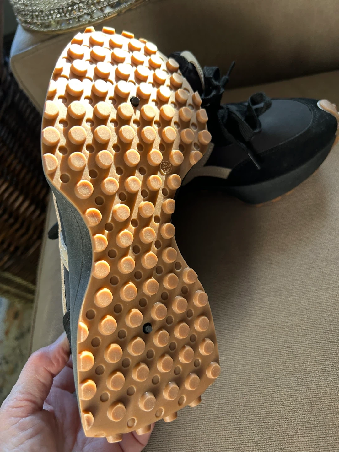 These New Balance shoes feature a black nylon and suede upper with tan accents. They're designed for both fashion and sport. Size 250 mm.