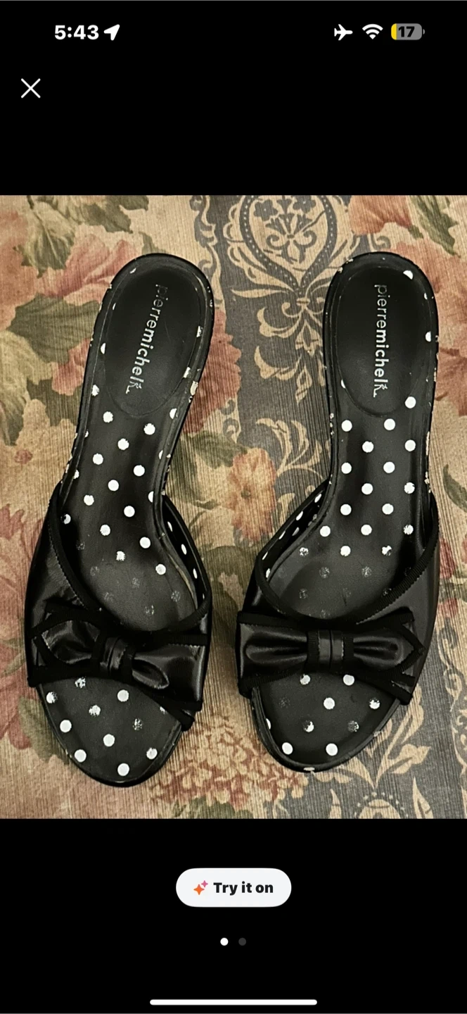 Cute Pierre Michele mules featuring a black and white polka dot design. They're adorned with a black satin bow on the toe strap. These slip-on mules offer a stylish and comfortable option.