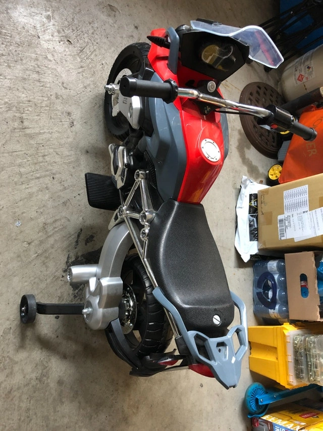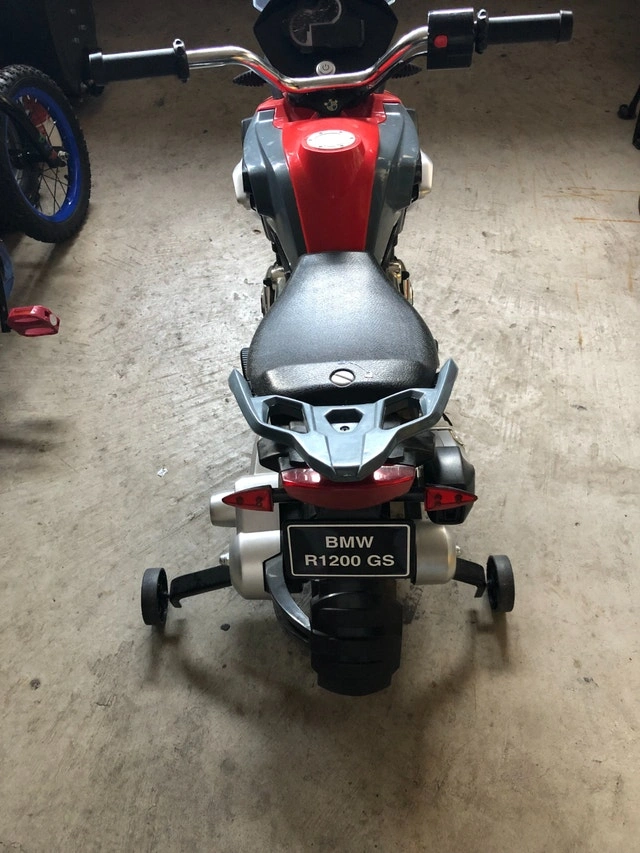 BMW 6 V Battery Operated Motorcycle - Forward & Reverse Options, 3 speed options, Working headlight, Removable training wheels. Priced to sell for $125. Retail price $200. Condition: Used - Like new. Cash accepted.