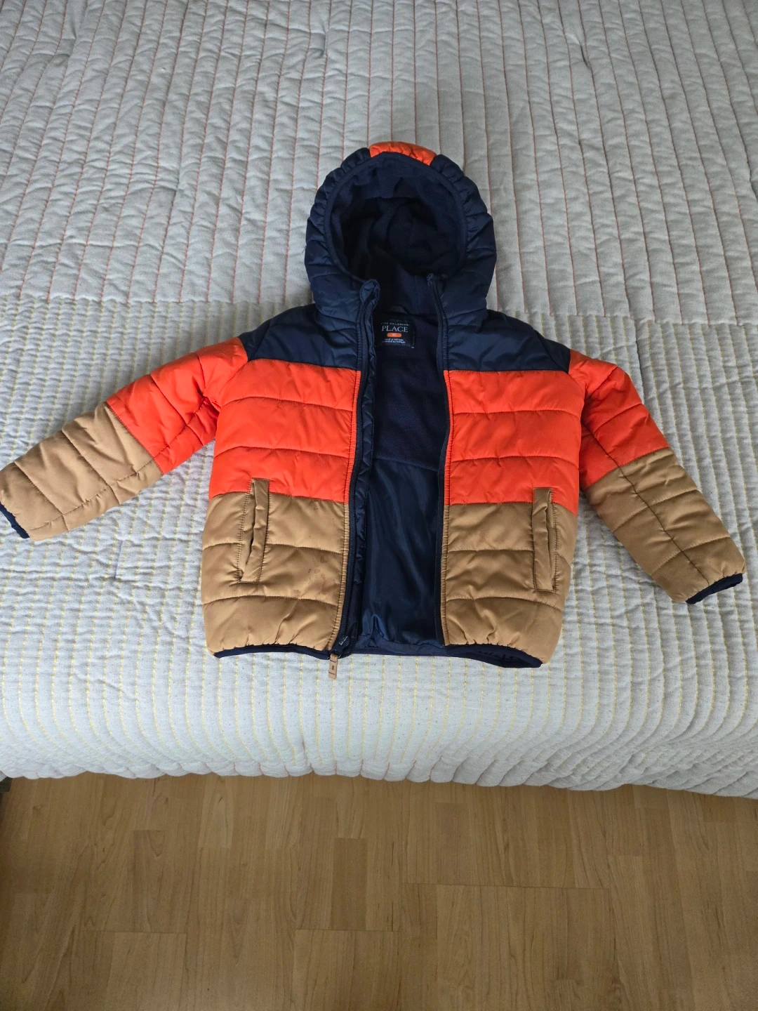 Here's a super cute puffer jacket from The Children's Place for boys! It's a size small and features a stylish colour-block design with navy, orange, and tan. Perfect for keeping your little one warm and cozy during the colder months. Cash only! Message if you interested!