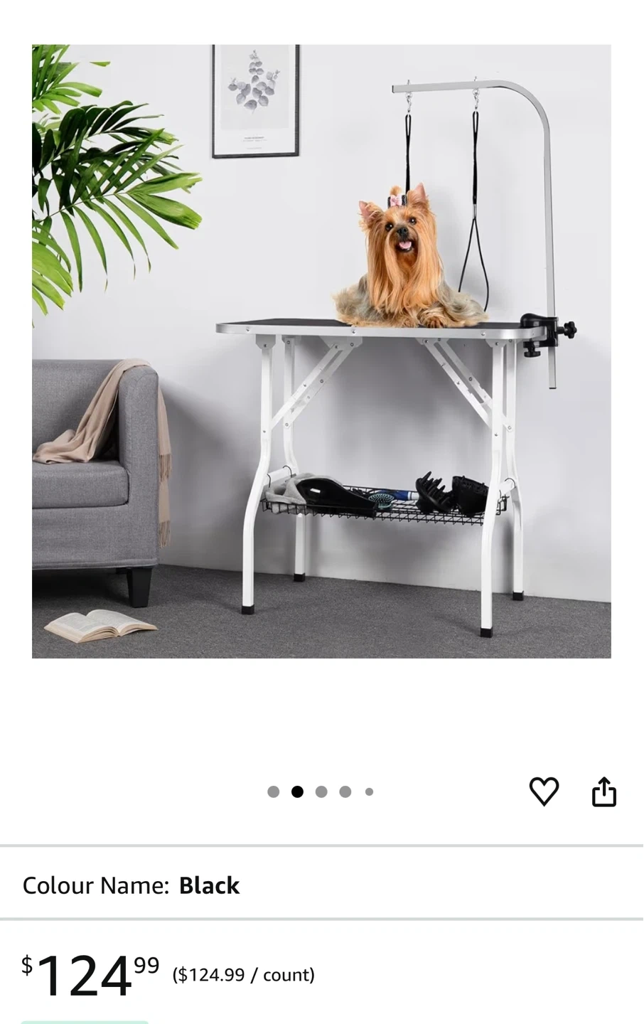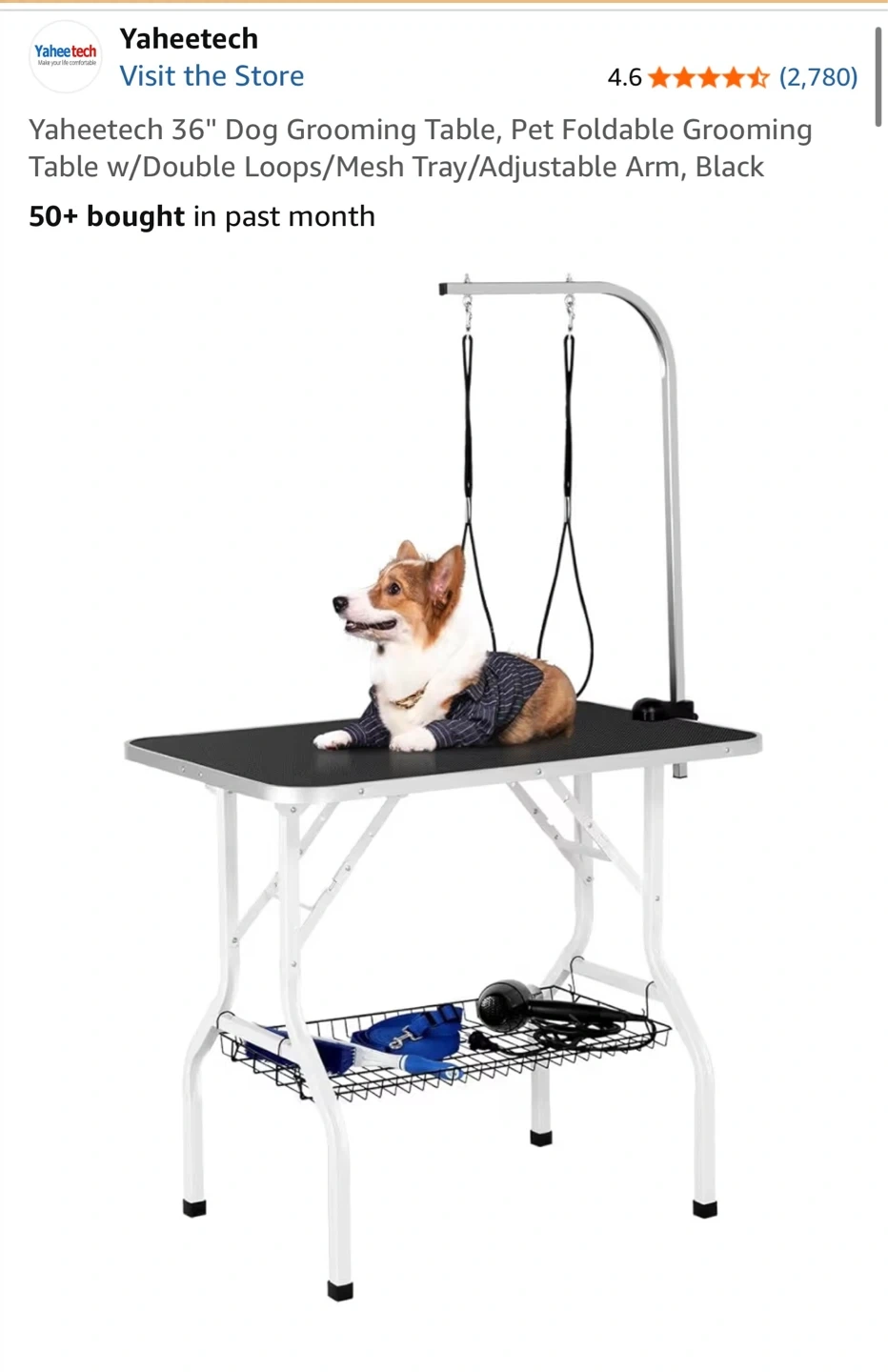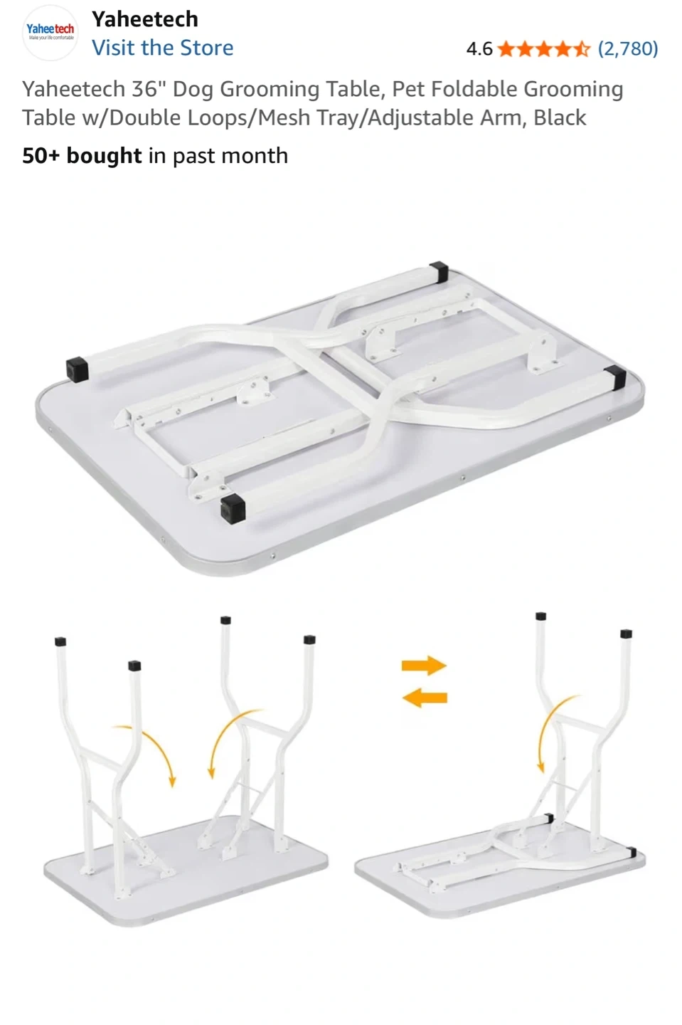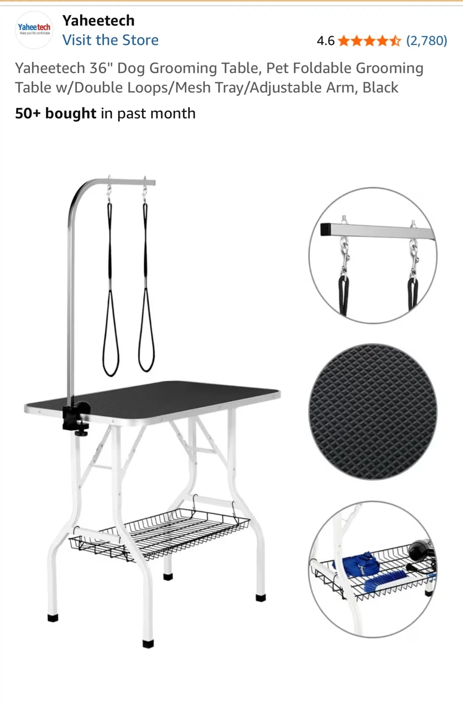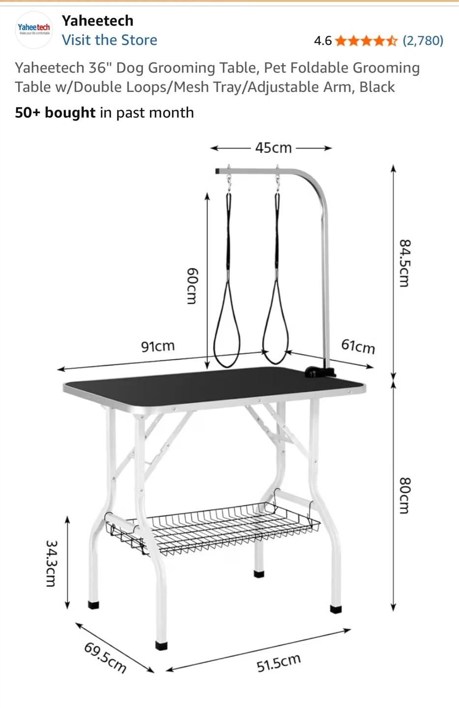 This black Yaheetech grooming table is 36 inches and foldable. It's equipped with a mesh tray and an adjustable arm with double loops. Dimensions are 91cm L x 61cm W.