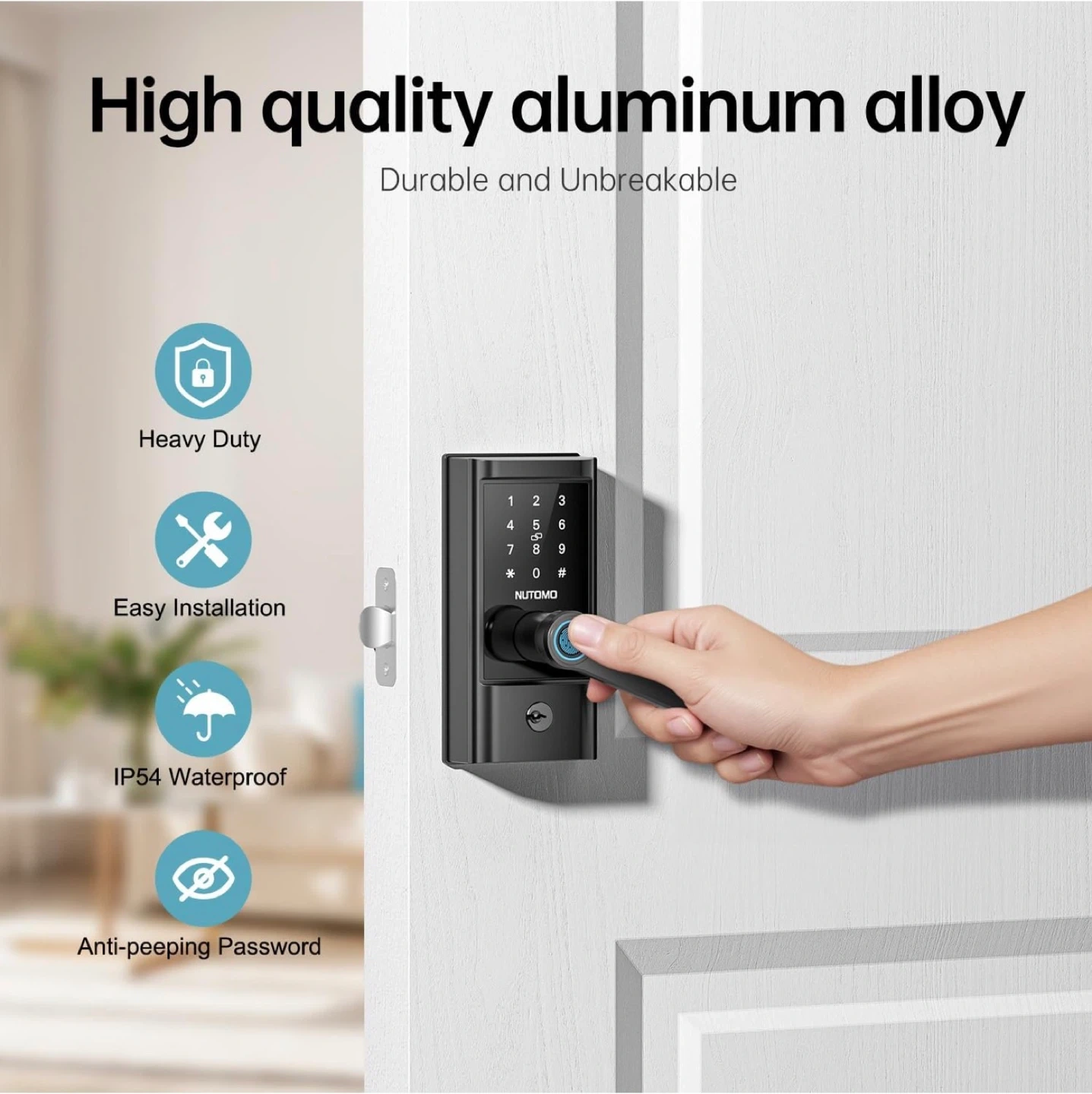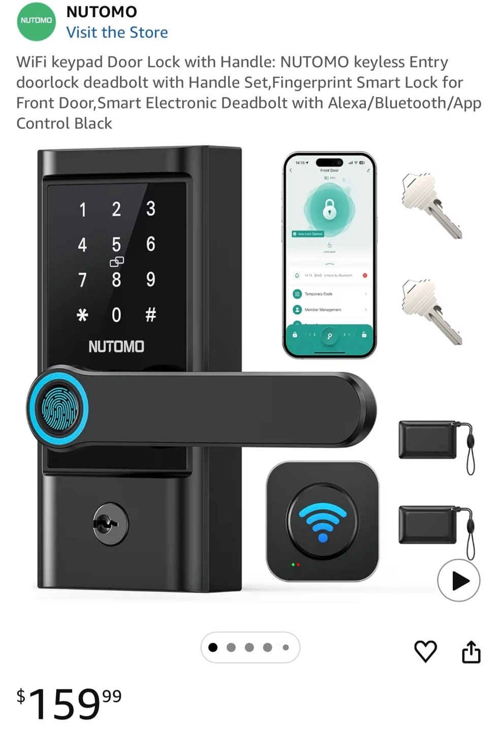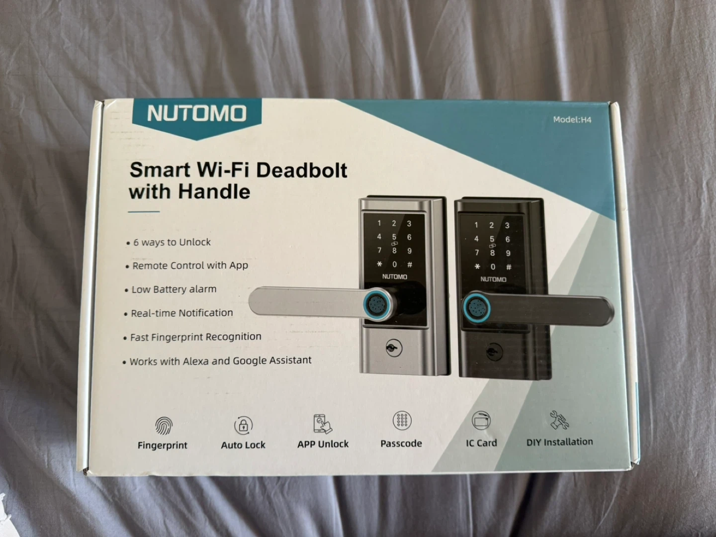 This NUTOMO Smart Wi-Fi Deadbolt with Handle, model H4, offers 6 ways to unlock. It features fast fingerprint recognition with a 99% recognition rate and 0.1s unlock speed. The lock includes remote control via app and works with Alexa and Google Assistant for added convenience.