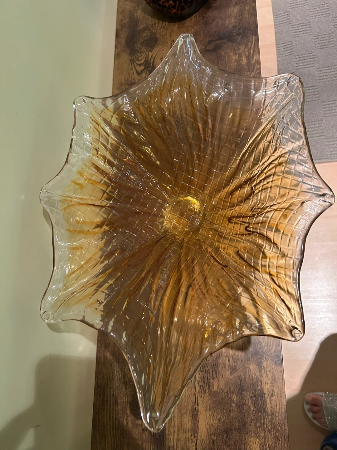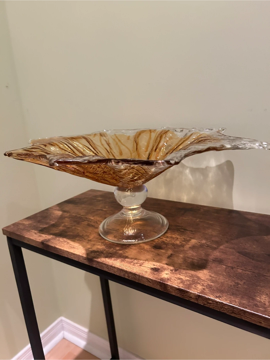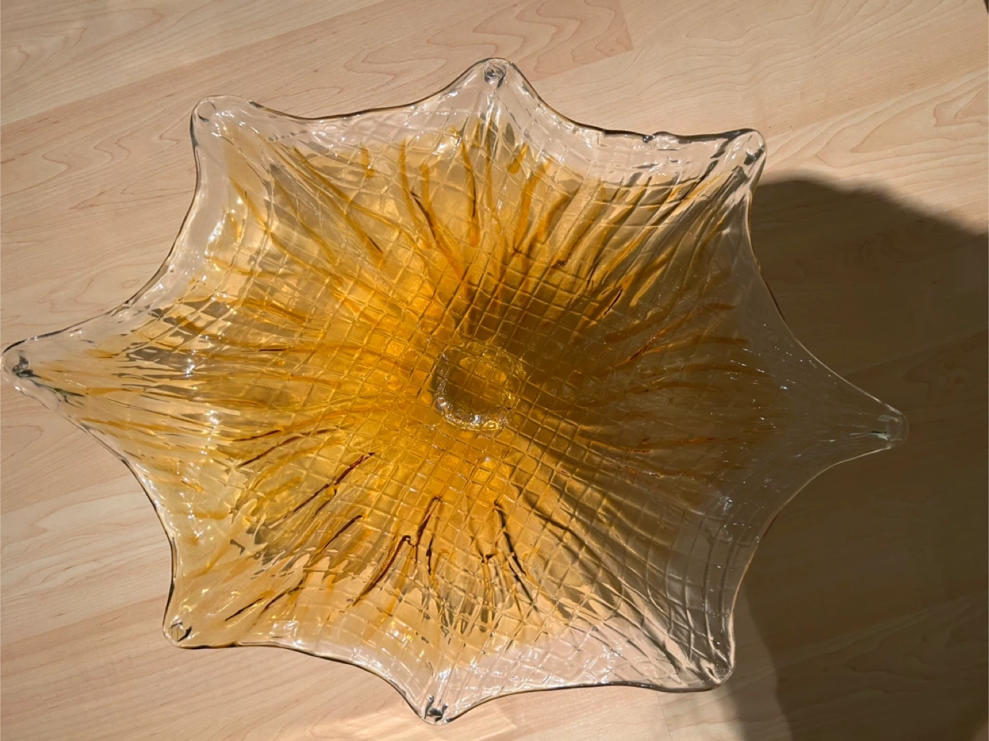 This eye-catching glass bowl features a starburst design with amber accents. It's crafted from clear glass with a textured, grid pattern radiating outwards. The bowl sits on a clear glass pedestal base.
