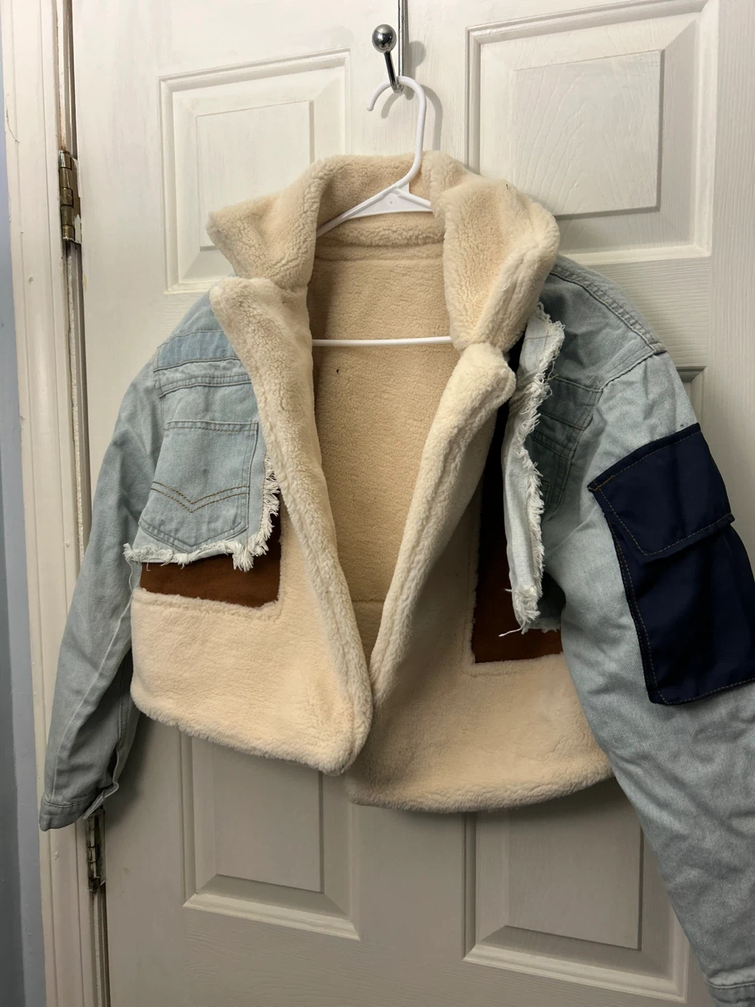 This distressed denim jacket features a cozy sherpa lining and stylish suede paneling. It's designed with a unique cut-out back and contrasting navy pockets. The jacket offers a warm and fashionable look for cooler weather.