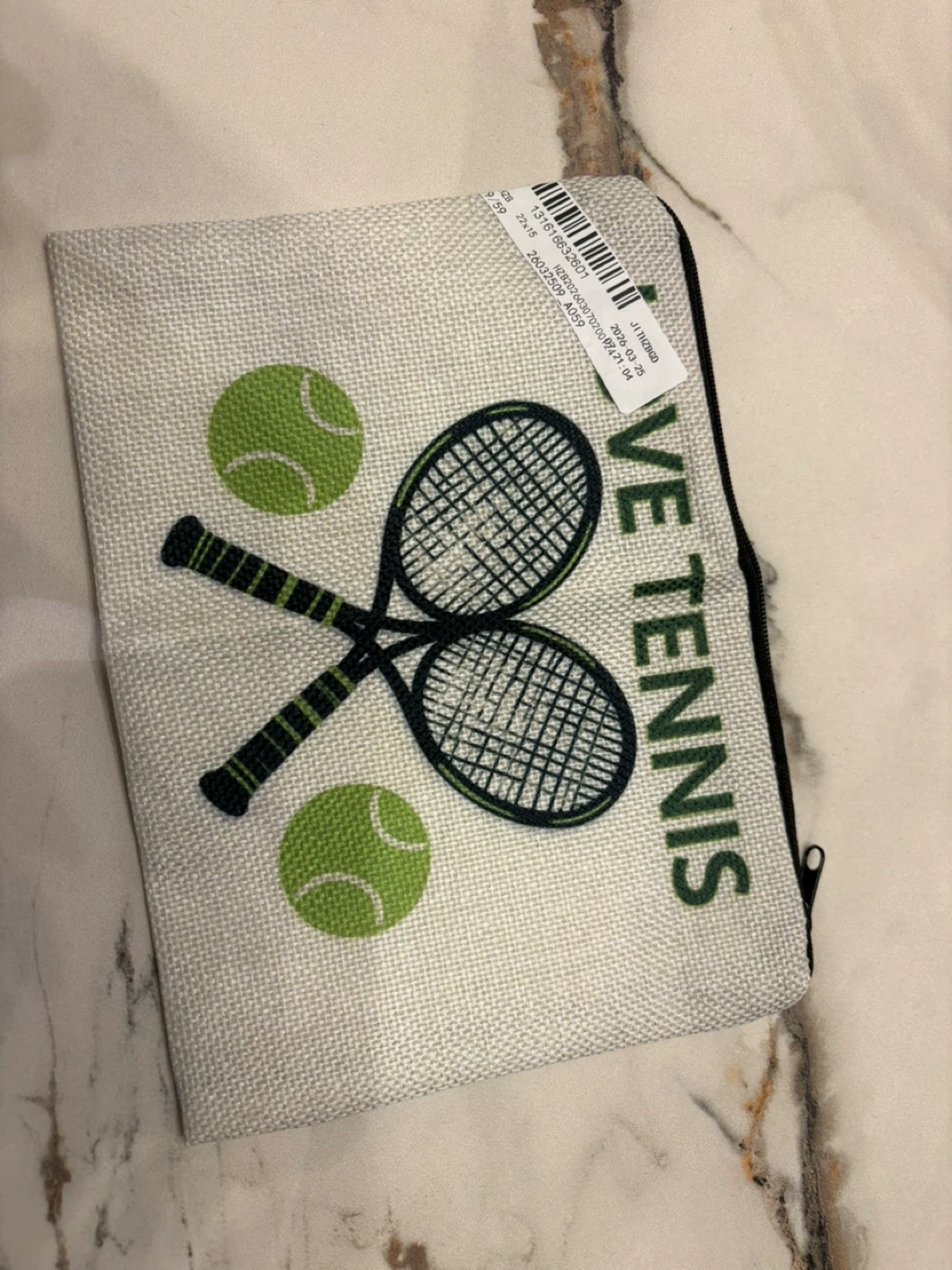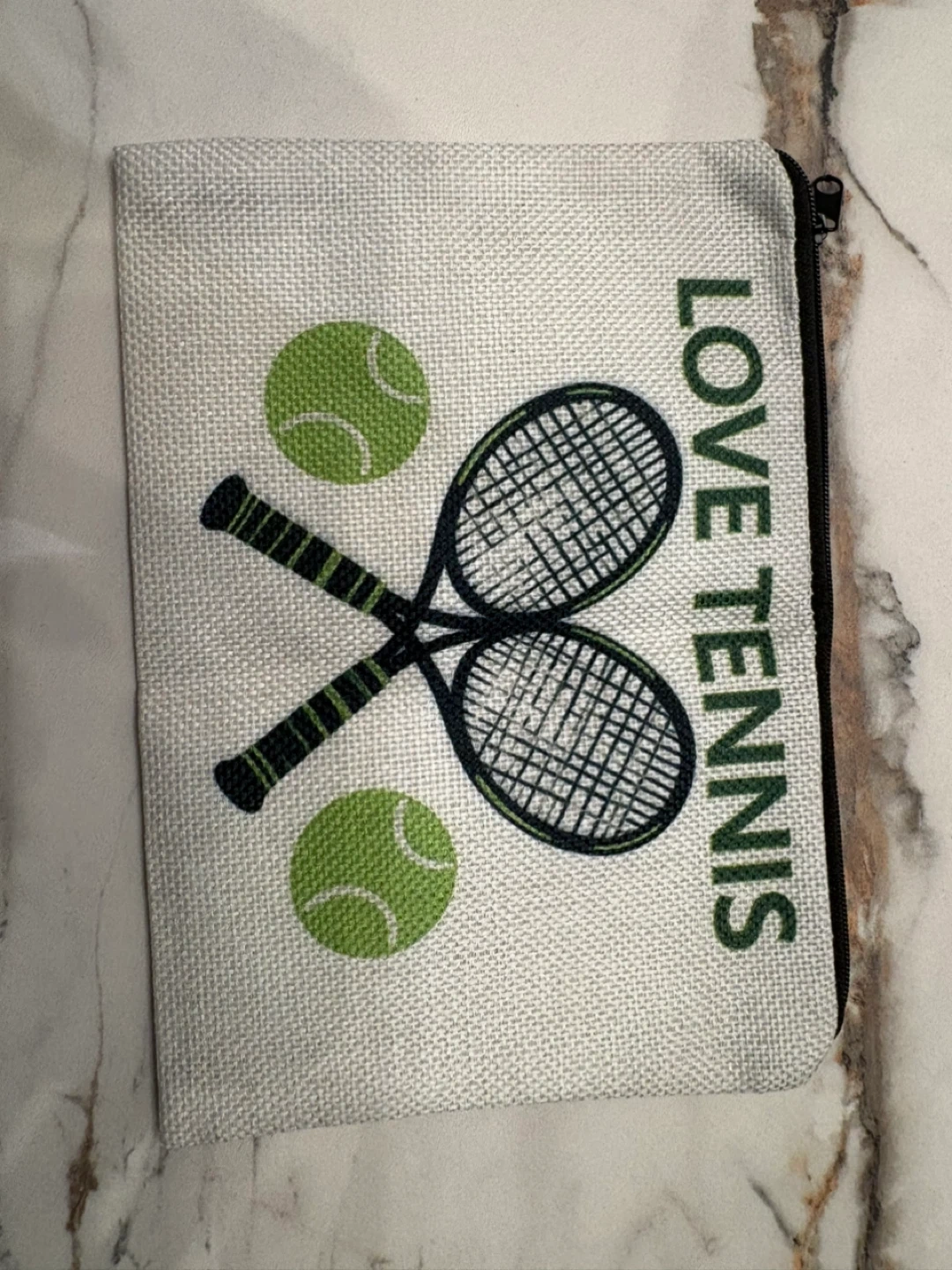 Zippered pouch with a "Love Tennis" graphic. It's great to be used as a make up bag or even as a pencil case.. It has a durable fabric construction. Brand New, never used.