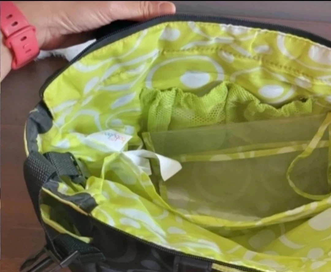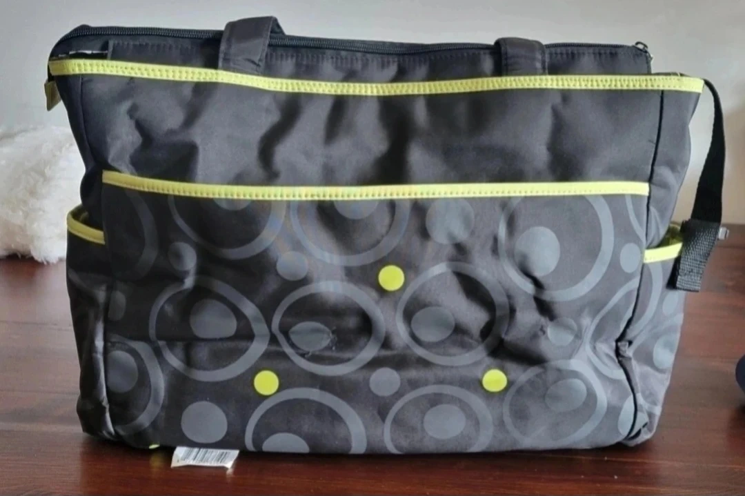 Giving away this Baby Boom diaper bag tote is grey with a fun circle and dot pattern in lime green. It features multiple pockets for organization. It's great for carrying all your baby's essentials when you're on the go!
