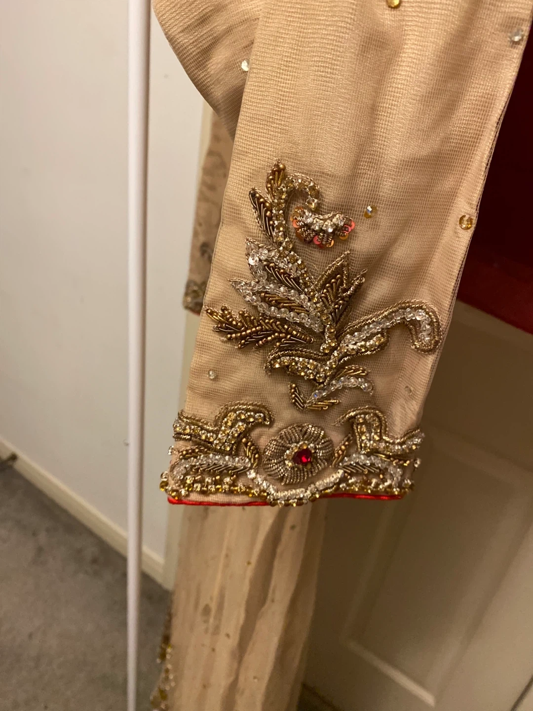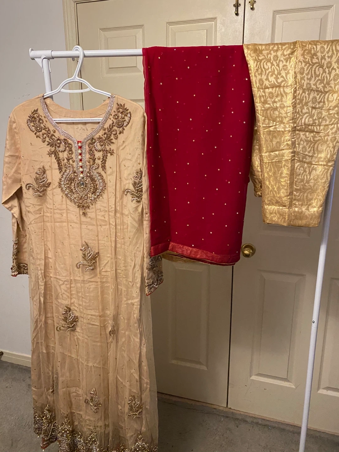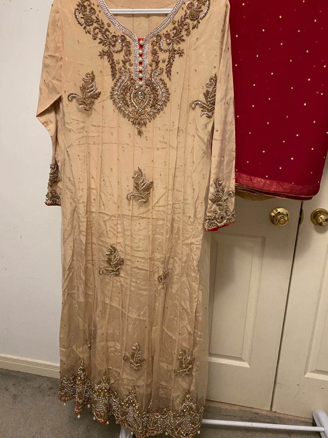 This is an embellished tan long Anarkali style shirt with intricate gold and pearl work. It's paired with a red dupatta scattered with small gold embellishments and matching gold self print pants. Perfect for special occasions!