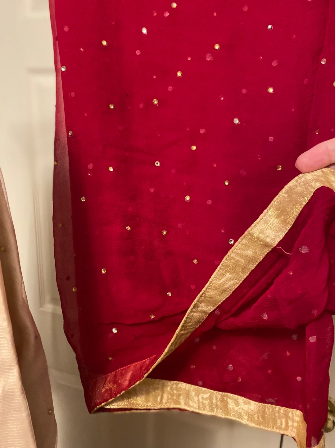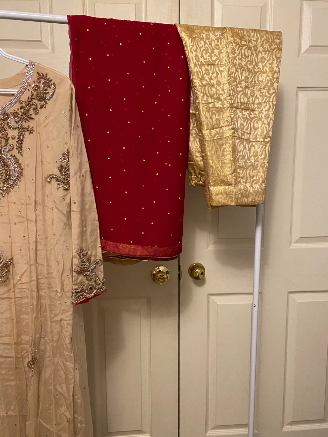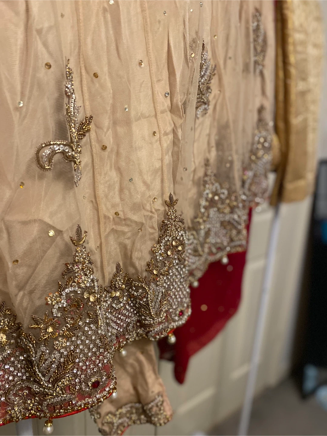 This is an embellished tan long Anarkali style shirt with intricate gold and pearl work. It's paired with a red dupatta scattered with small gold embellishments and matching gold self print pants. Perfect for special occasions!