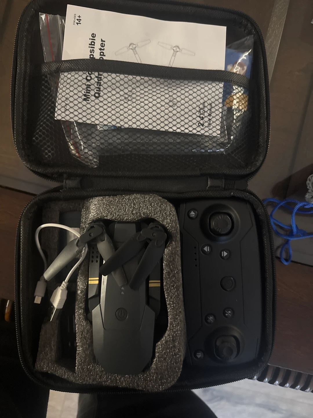 Selling a mini foldable quadcopter drone. It comes with its case, charger, and instructions. Perfect for beginners or hobbyists looking for a portable drone!