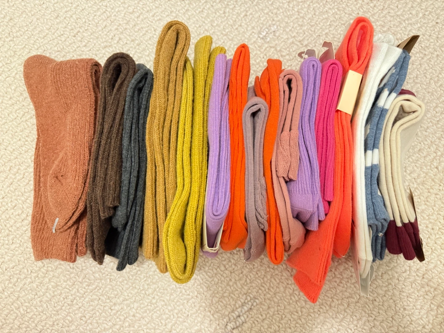 This is a collection of 16 pairs of knit socks in various colours and patterns. It's a great way to add some fun to your sock drawer. They're made from a soft, comfortable knit material.