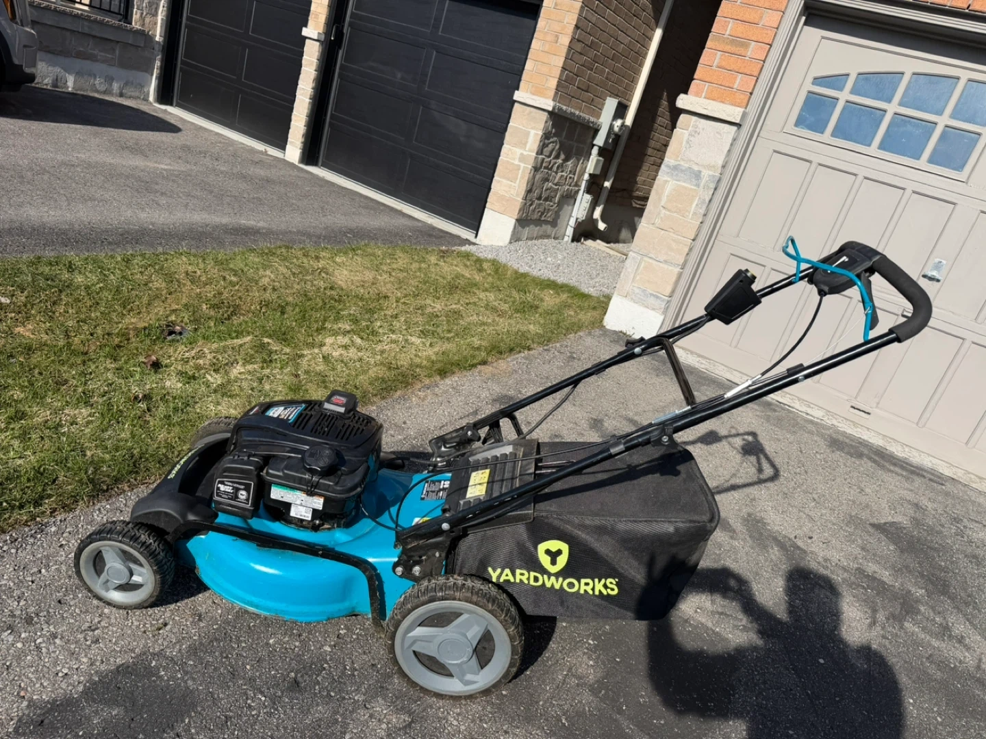 YARDWORKS 72V lawn mower with a Briggs & Stratton 163cc OHV engine. Self-propelled model with mulching capability. Has a 21-inch cutting deck. Easy to start and manoeuvre. Keeps your lawn looking sharp!