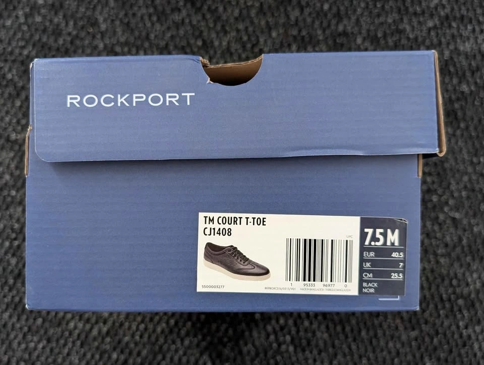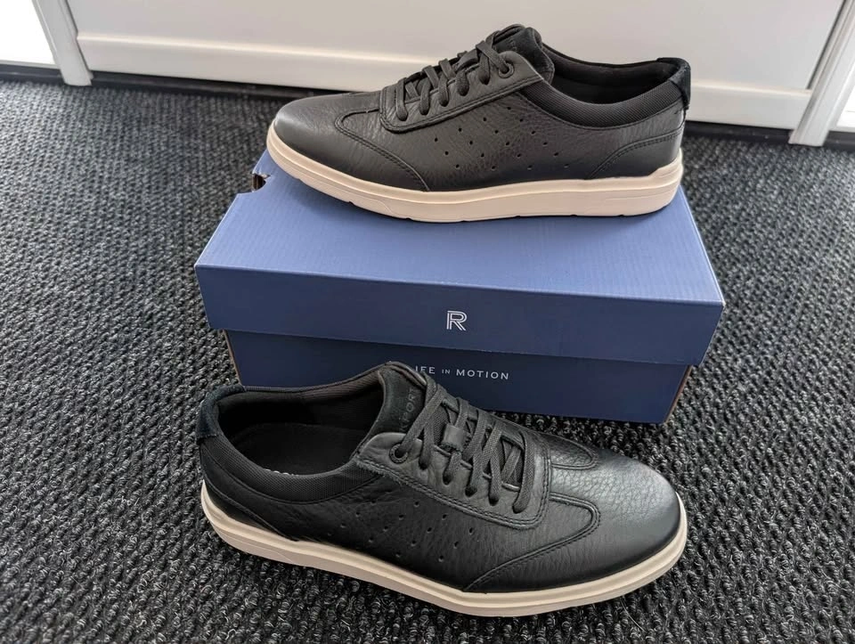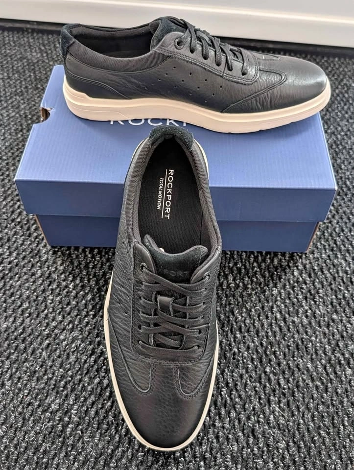 Selling brand new Rockport Total Motion Court T-Toe sneakers in black leather. Never worn, only taken out for photos. Size men's 7.5 M.