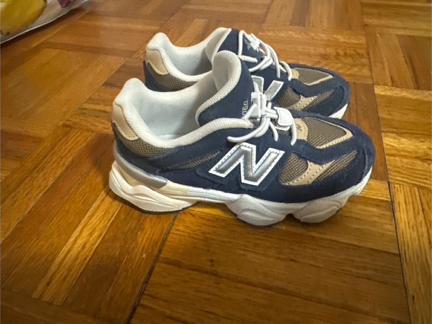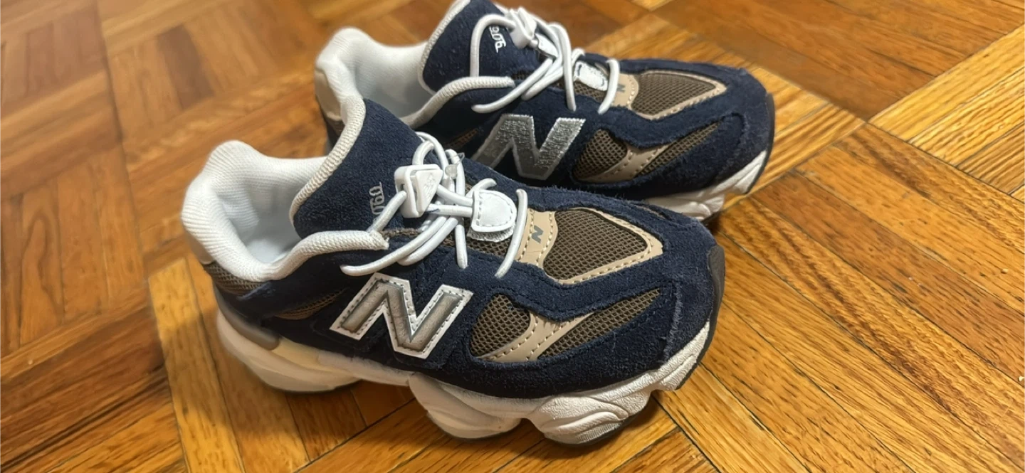 New Balance 9060 sneakers in Navy Mushroom. These kids' shoes feature a suede and mesh upper. It's a classic athletic shoe design for little ones.