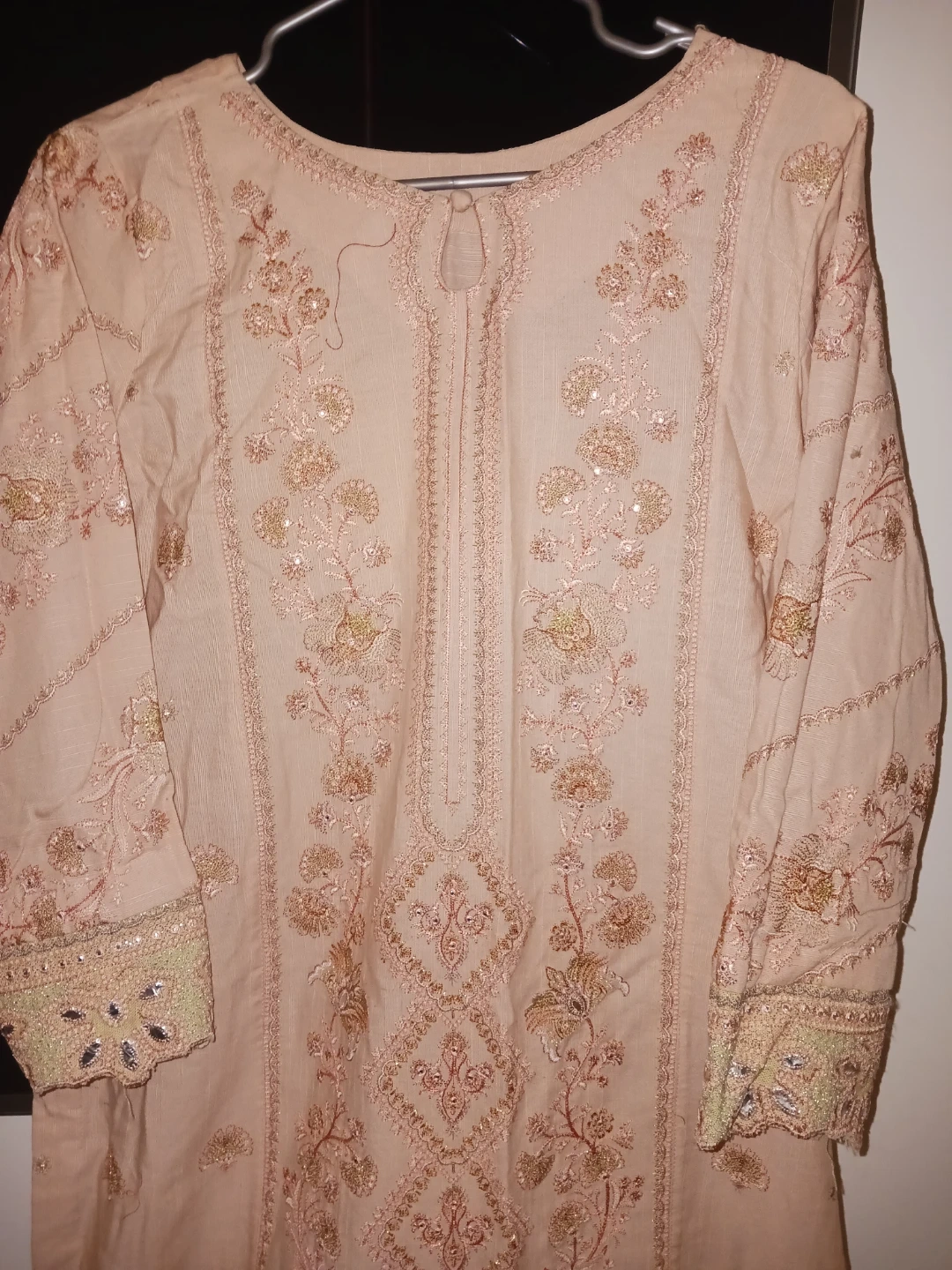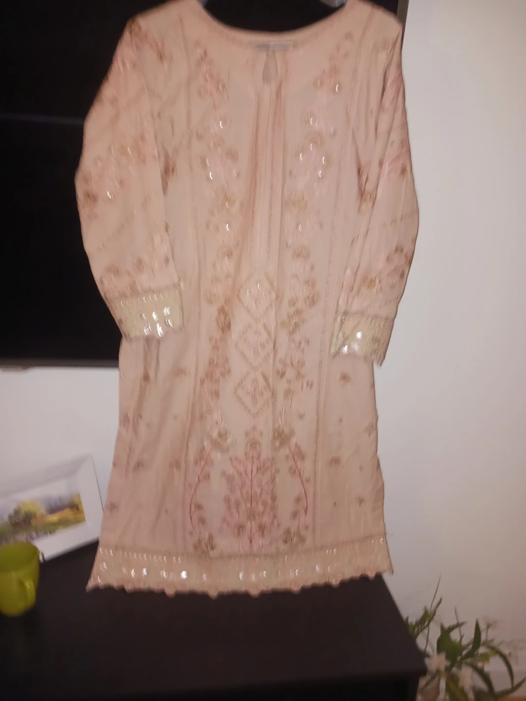 Pretty pink kurti with intricate embroidery and sequin accents. Comes with matching comfortable pants. Perfect for casual wear or dressing up!