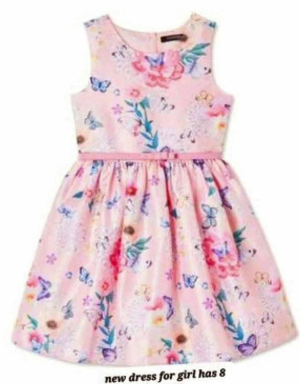 This adorable purple velvet dress features a beautiful butterfly and floral print. It comes with a matching purse, perfect for little ones! It has long sleeves and a sparkly shimmer throughout.