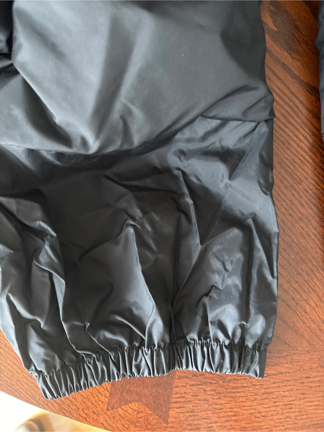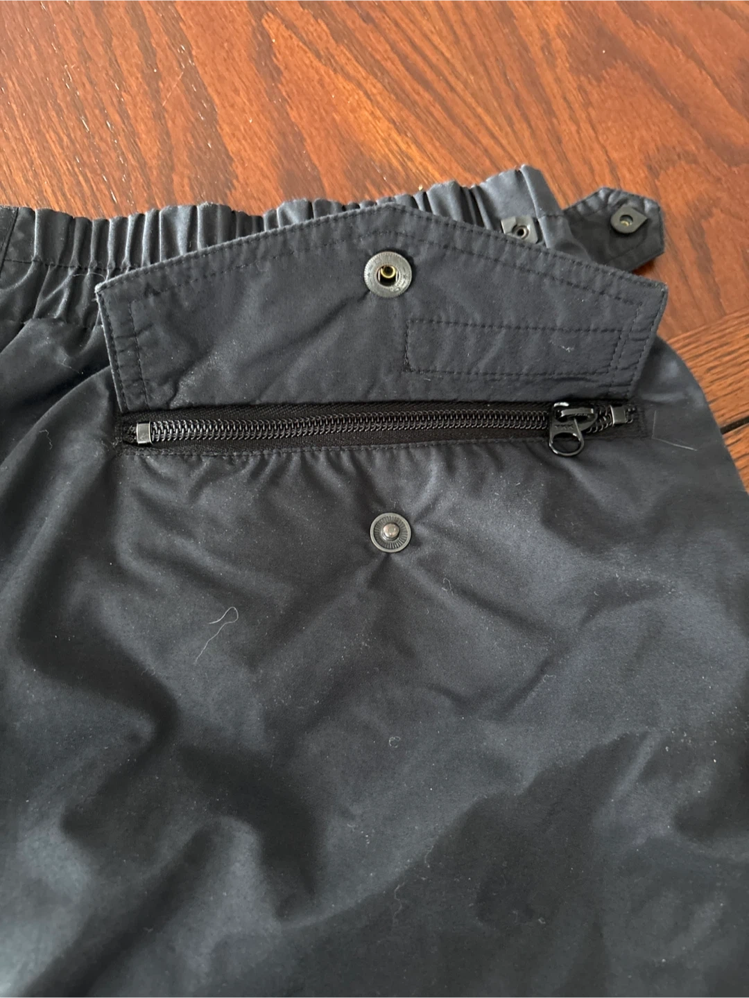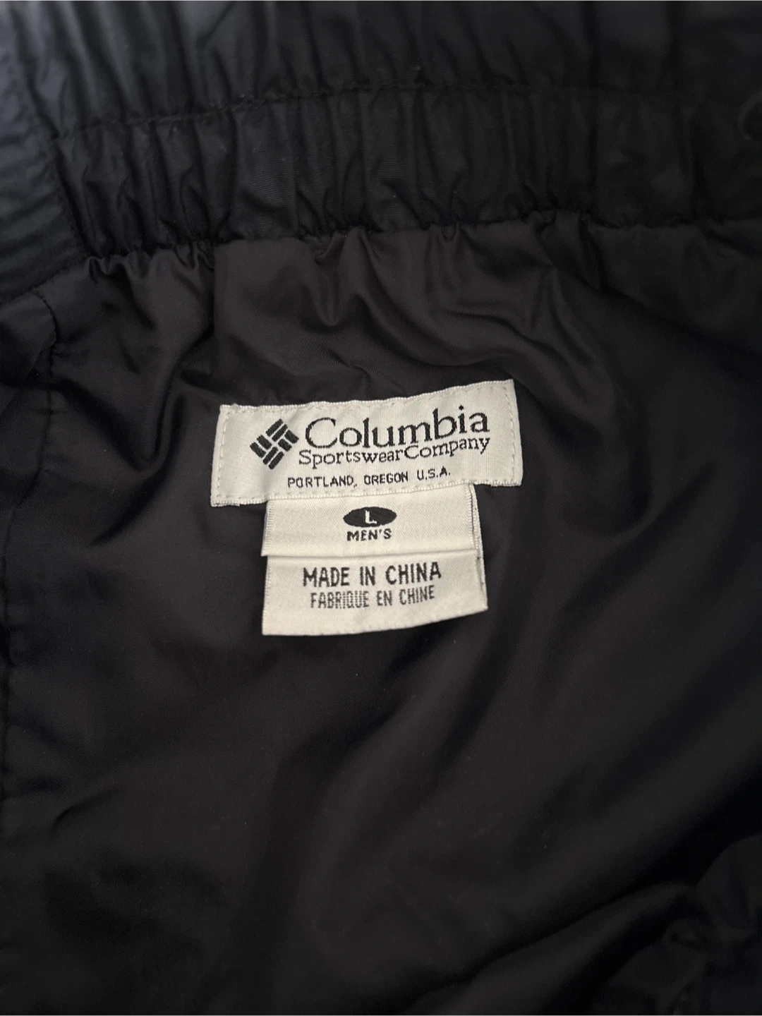 These Columbia Sportswear pants are black and men's size large. They feature an elastic waistband with snaps at the back and a zippered pocket on the back. Built for comfort and durability!