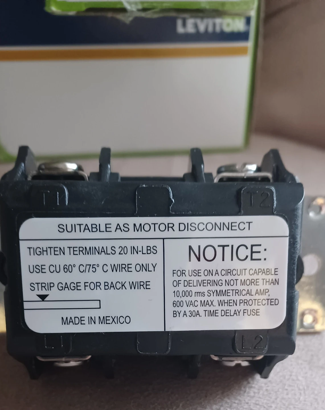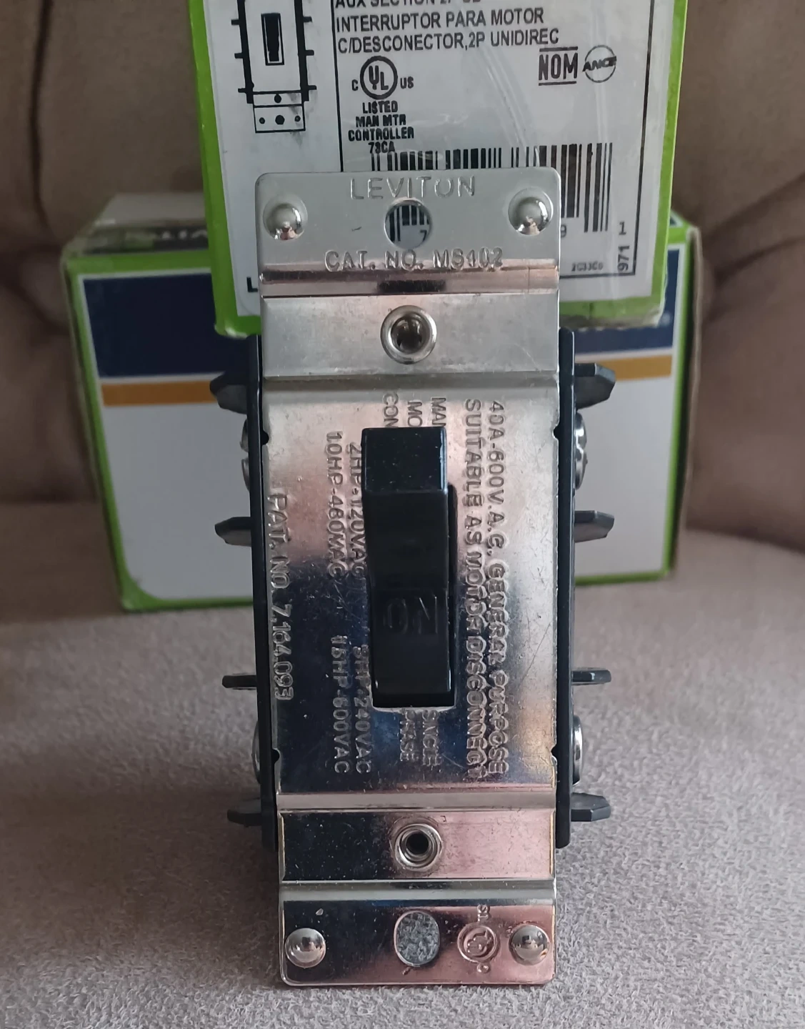 This is a Leviton MS402-DS motor starter switch. It's a single throw disc type with 2 poles. Rated for 40A and 600VAC, it's suitable as a motor disconnect. Made in Mexico.