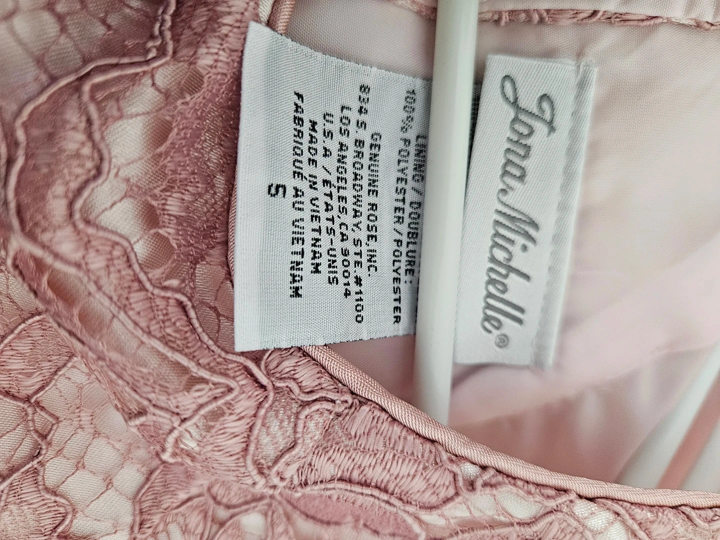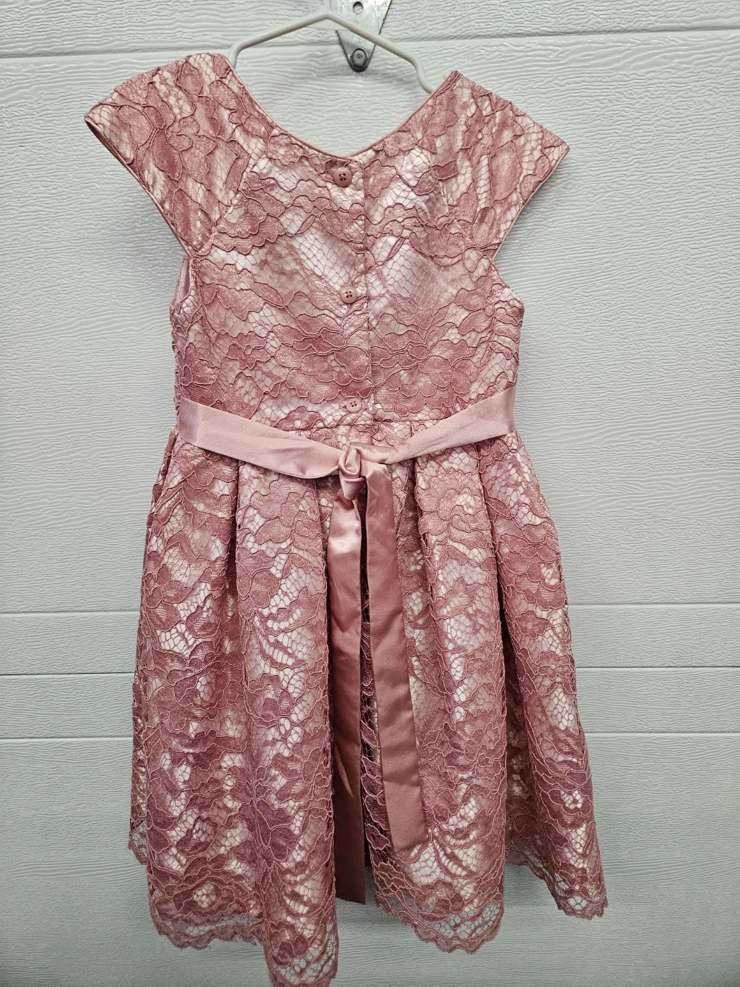 This Lona Michelle girls' dress is a beautiful pink lace design. It's a size 5 and features a satin sash with a bow. The lining is 100% polyester.