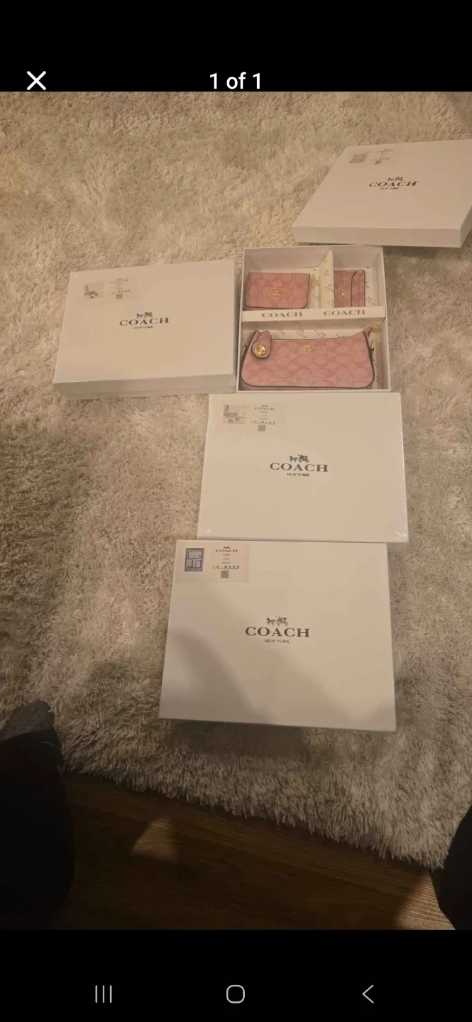 This is a Coach set including a small wallet and a cardholder, both in pink with the signature monogram pattern. They come in Coach gift boxes. The set includes a small shoulder bag, a zip cardholder, and a flat cardholder.. its a one on one kind.
