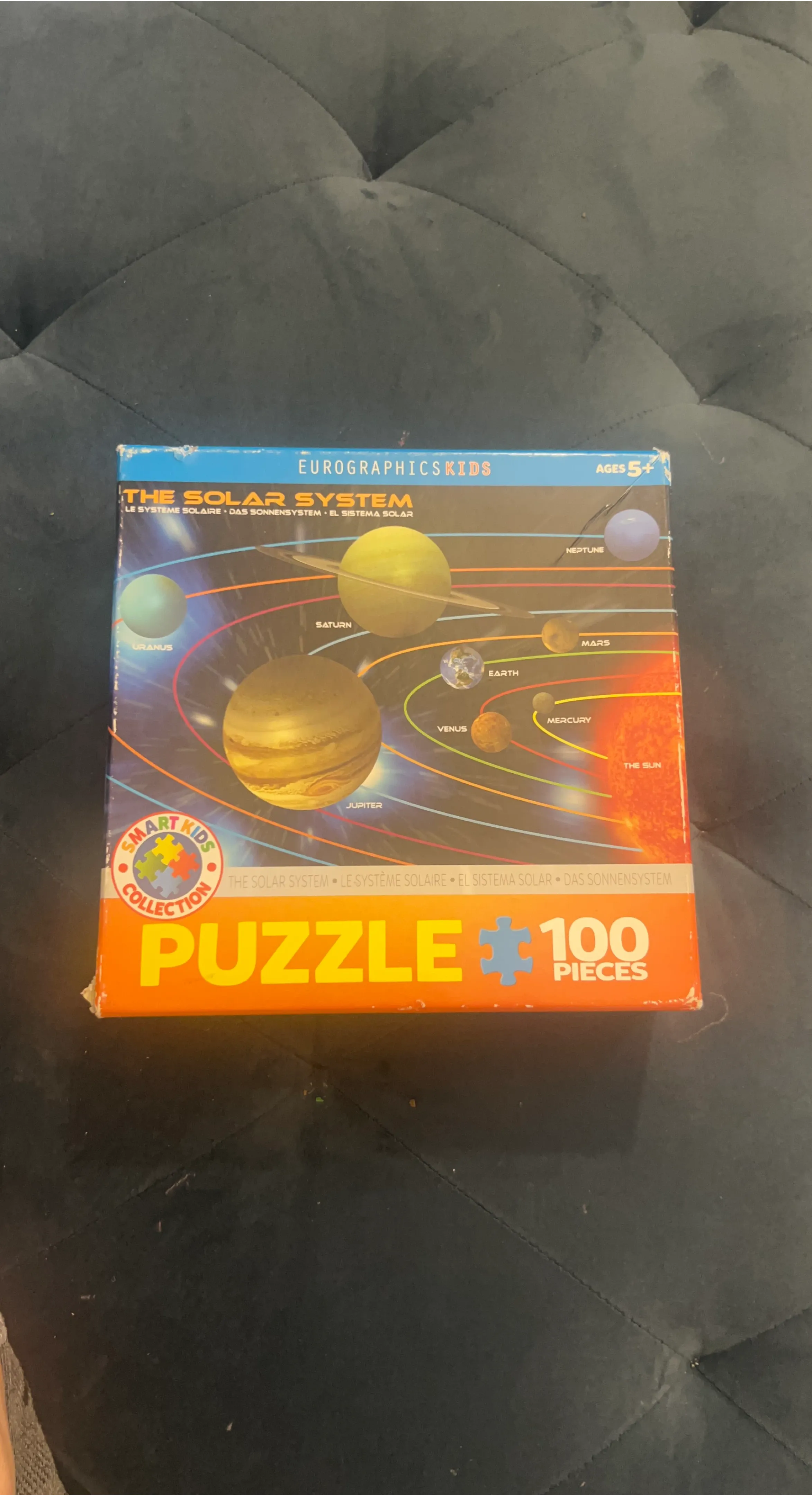 Selling a Eurographics Kids Solar System puzzle! It's a 100-piece puzzle designed for ages 5+. The puzzle features a colorful illustration of the solar system, including planets like Earth, Mars, Jupiter, and Saturn