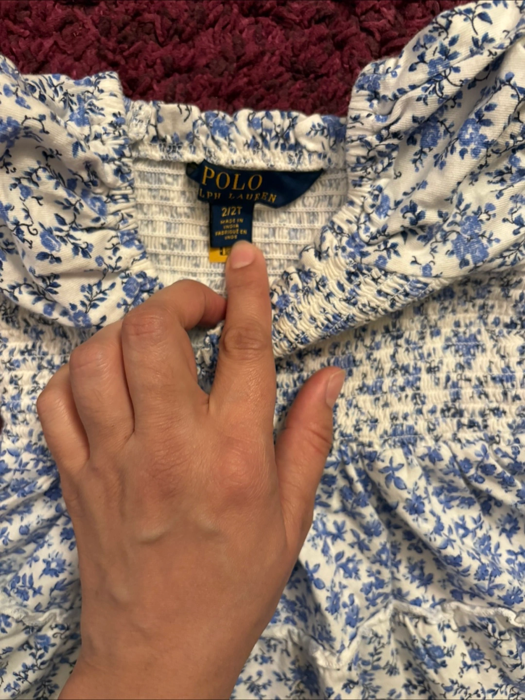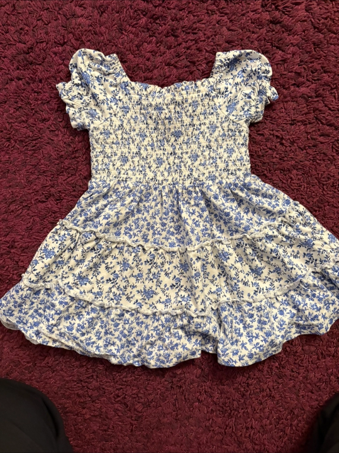 Lovely blue and white floral dress. Features a ruched bodice and tiered skirt. Perfect for a summer day.