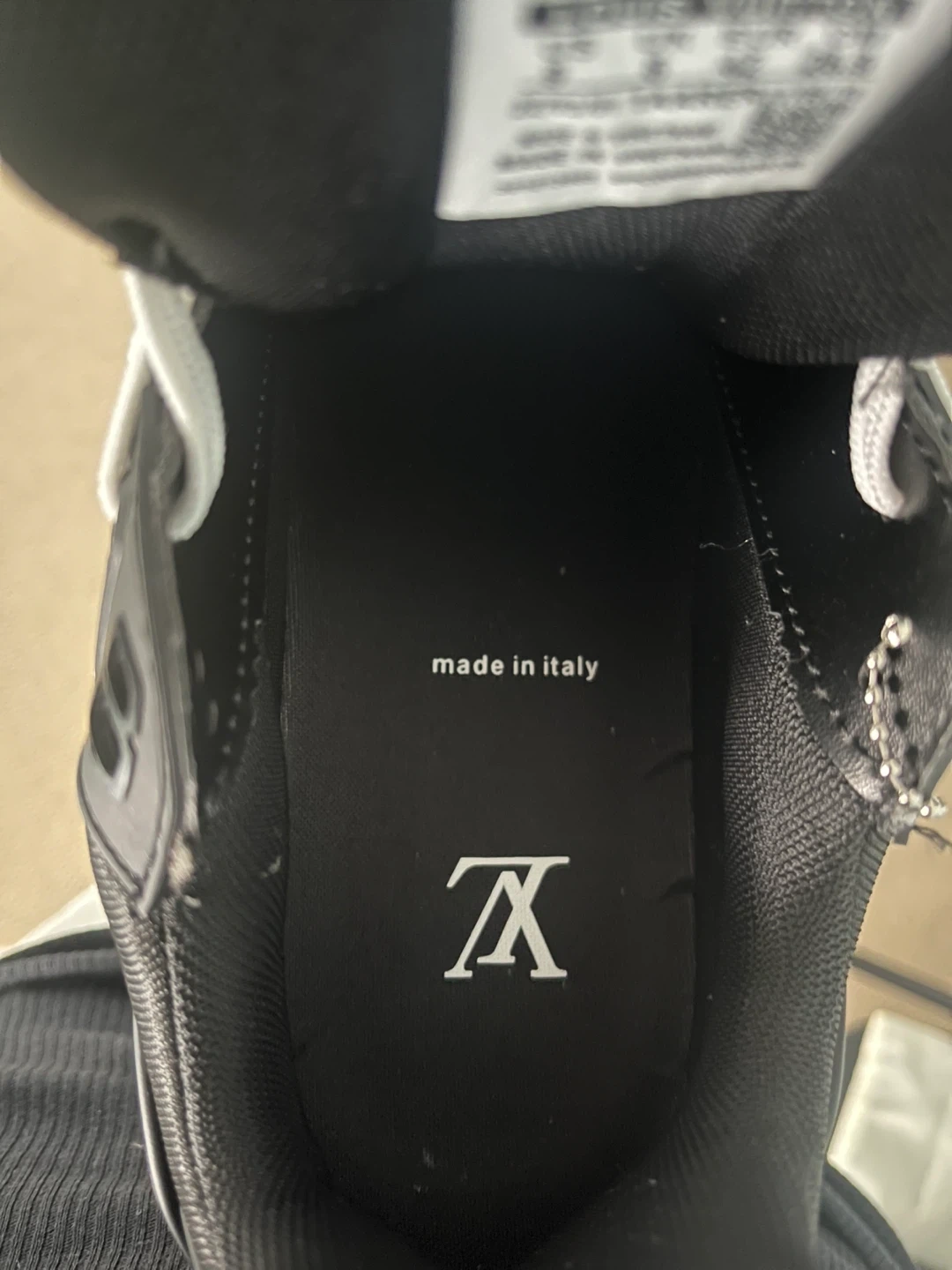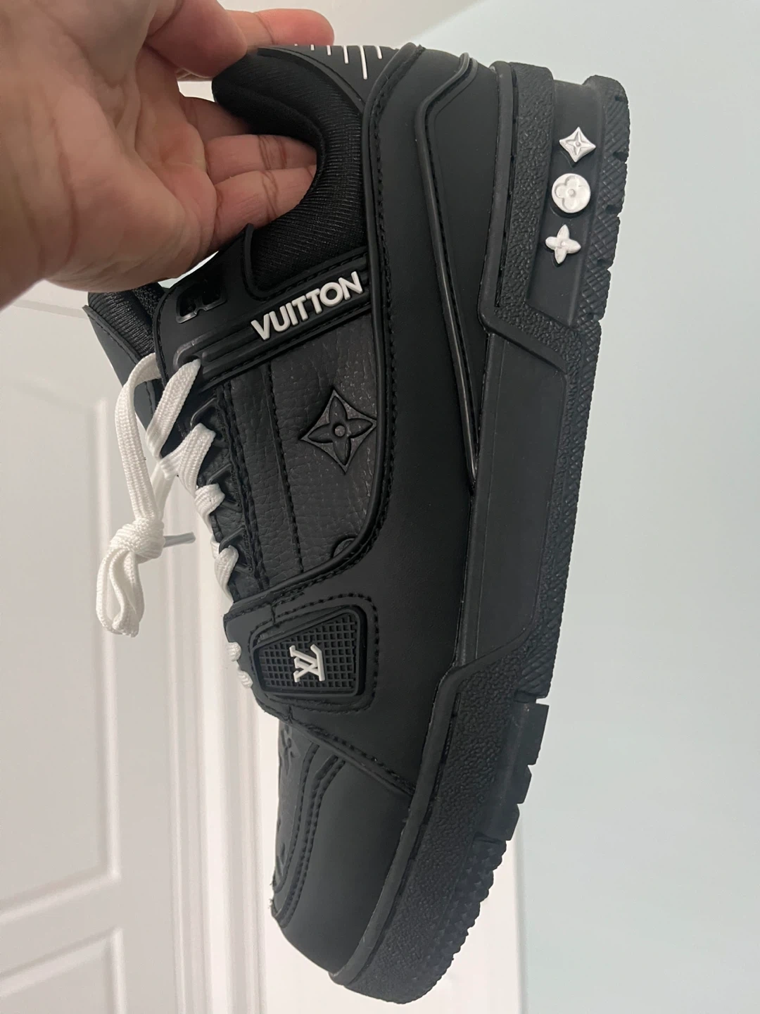 Louis Vuitton black leather sneakers featuring the iconic monogram pattern. Made in Italy with a visible LV logo on the heel and toe box. These stylish kicks come with white laces and original box.