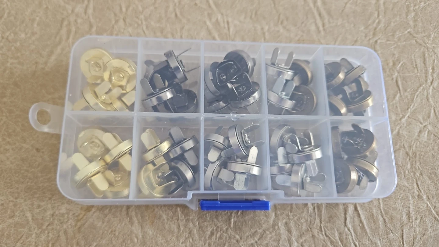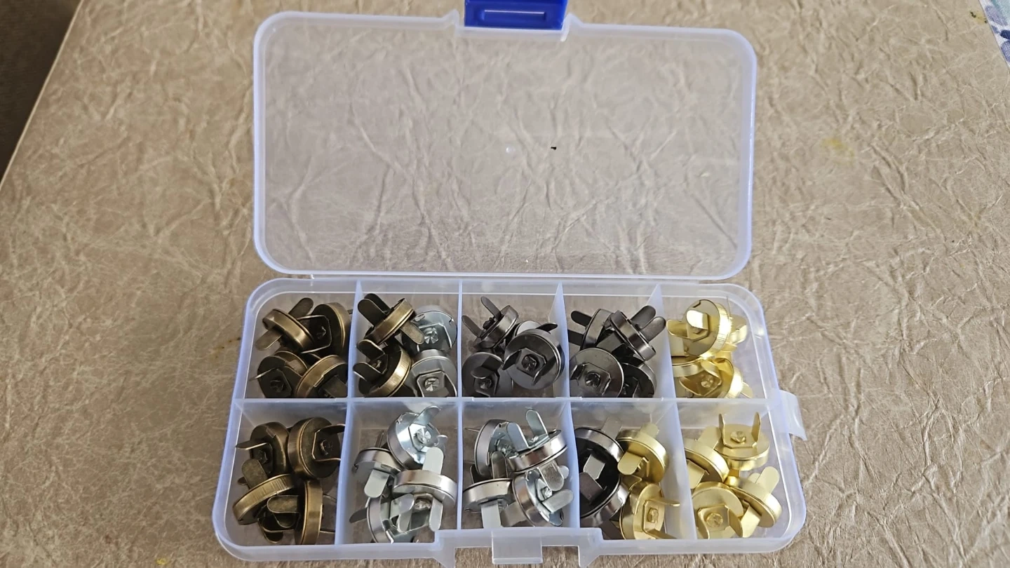Brand new and never used. If you make tote bags, purses, wallets, or backpacks, these snaps are what you need as the final touch! Available in 4 metal finishes: silver, Grey, bronze, and gold. 40 pieces in total and comes with the storage box.