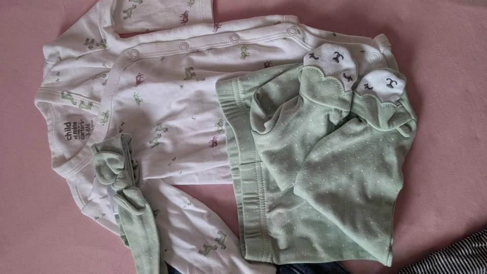 Adorable baby girl clothes bundle! Includes a denim jacket, a striped short sleeve bodysuit, a Child of Mine by Carter's long sleeve elephant print bodysuit, mint green polka dot footed pants with little animal faces, and a matching mint green bow headband. All size 3-6 months. EUC SFH. Pickup only St Clair Ave East and O'Connor.