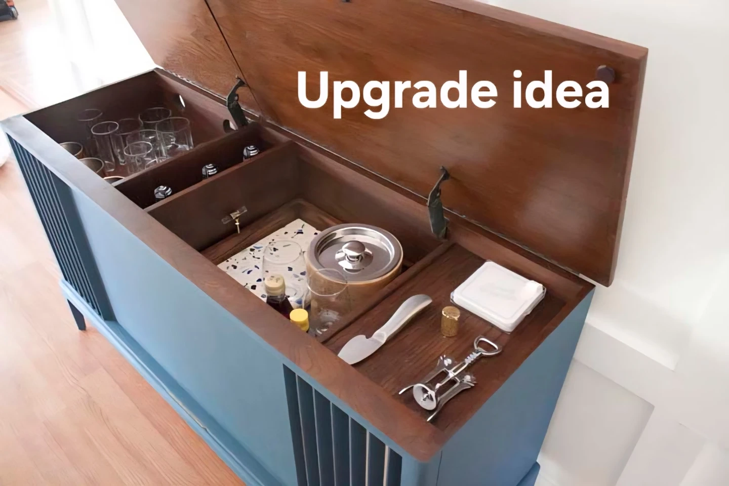 The crowning jewel of this stereo is its distressed walnut console that is in excellent condition. It could be converted to a bar, a cabinet, (see Photo) or modernized with new audio components.