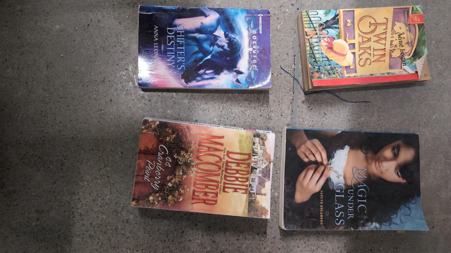 Four paperback romance novels by Harlequin and Debbie Macomber. "Shifter's Destiny" by Anna Leonard and "Magic Under Glass" by Jaclyn Dolamore. "Twin Oaks" by Anne Logan and "44 Cranberry Point" by Debbie Macomber. Perfect for romance readers!