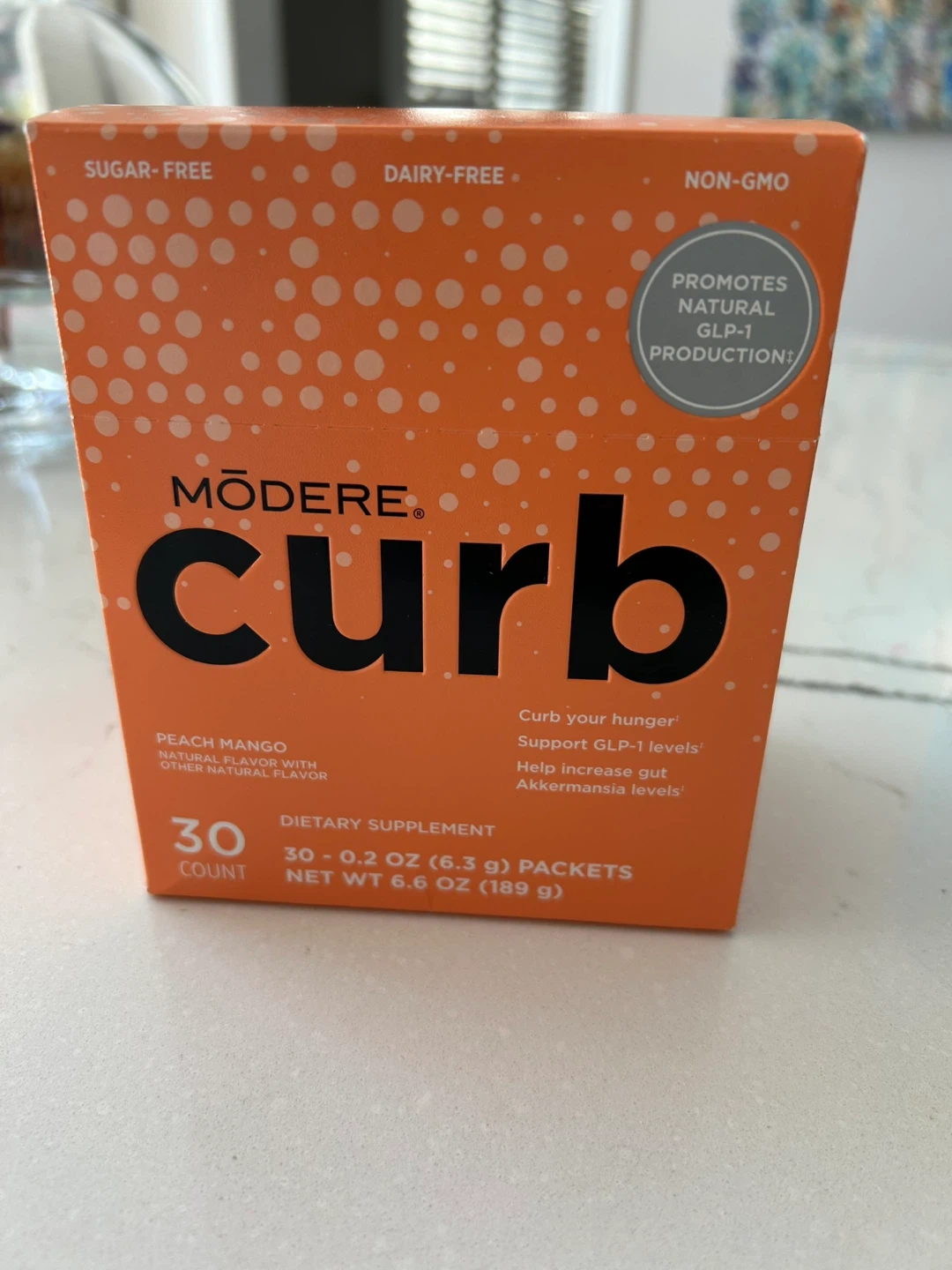 This Modere Curb dietary supplement comes in Peach Mango flavor. It's sugar-free, dairy-free, and non-GMO. Contains 30 packets, each 0.2 oz (6.3 g), for a total net weight of 6.6 oz (189 g). Promotes natural GLP-1 production and helps increase gut Akkermansia levels.