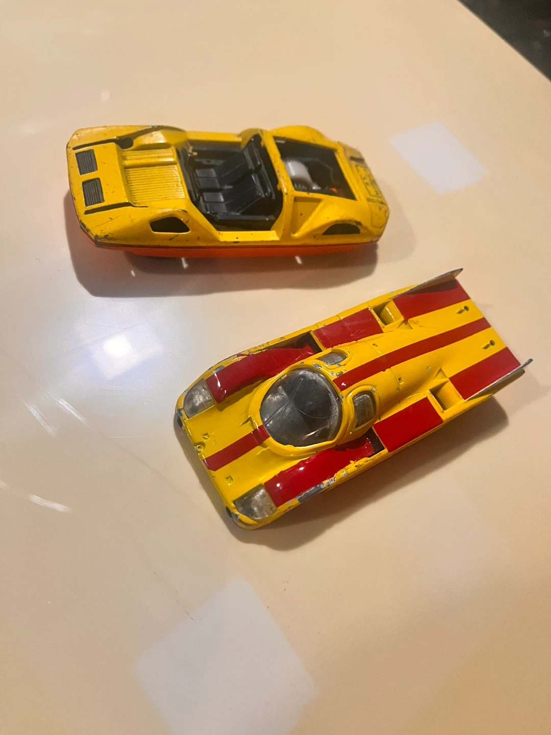 Two vintage die-cast toy race cars, one yellow with an orange base and the other yellow with red stripes. Both appear to be from the same era and style. Great for collectors or for play! Rough shape but cool old pieces