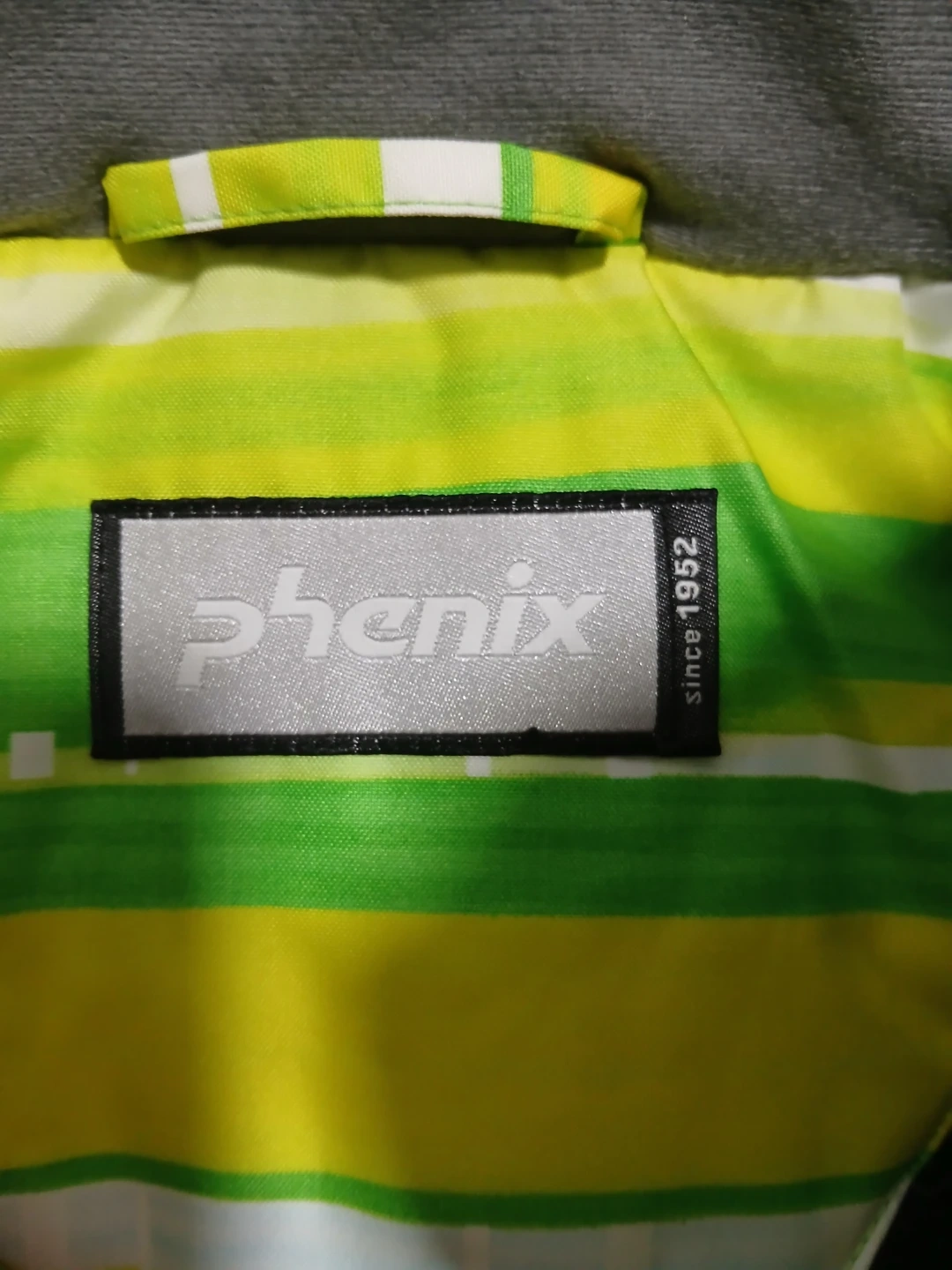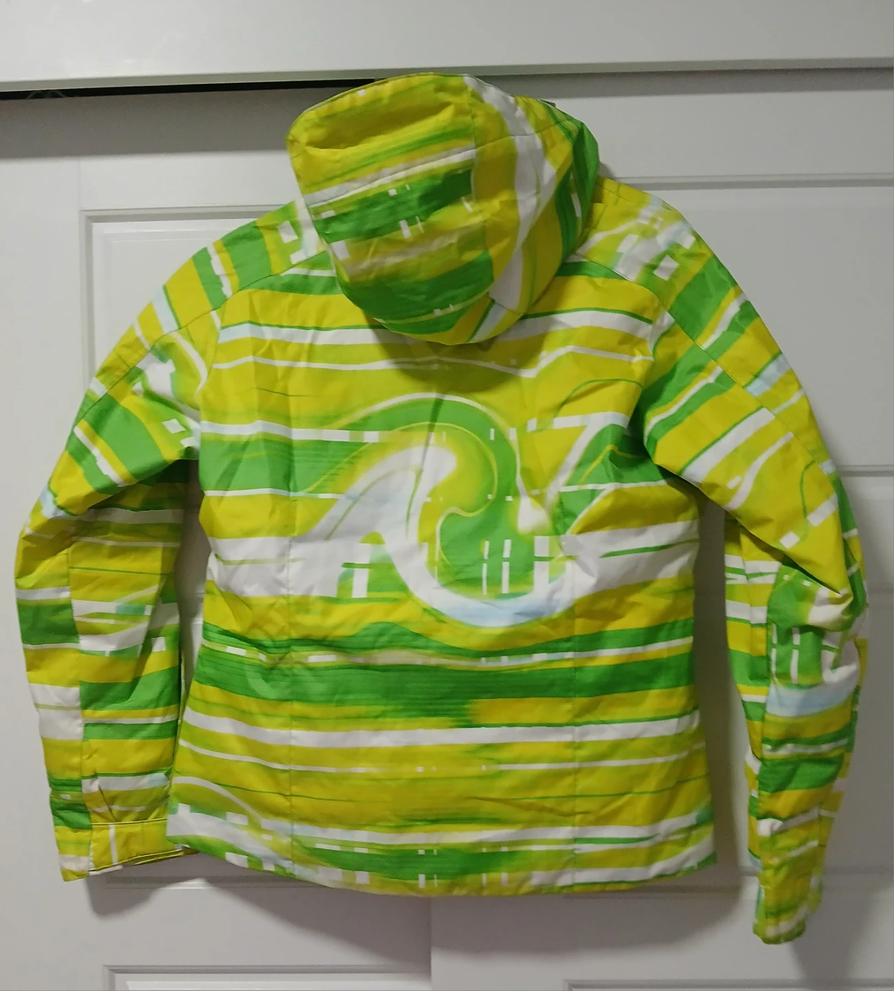 Phenix women's ski jacket in a vibrant green and yellow striped pattern. It's designed for outdoor winter activities. This jacket is great for hitting the slopes!