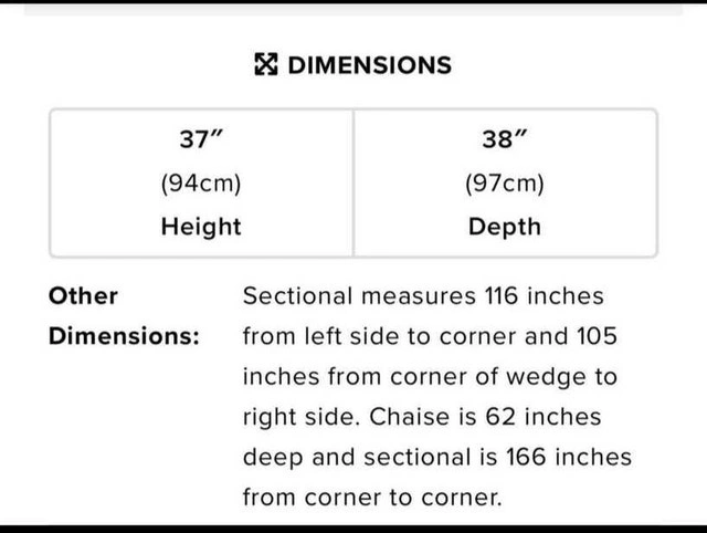 This is a used 6-piece sectional couch, perfect for a large living space and relaxing. The couch is in good condition and ready for a new home. It measures 116 inches from left side to corner and 105 inches from corner of wedge to right side. Chaise is 62 inches deep and sectional is 166 inches from corner to corner. Dimensions are also available in the photos. Height: 37 inches (94cm), Depth: 38 inches (97cm). Looking for a comfy spot to land after a long day? Or maybe you need a place to binge-watch your favourite shows? Either way, this sectional is ready to be your new best friend! If the ad is up, the sectional is available! Payment: Cash accepted.