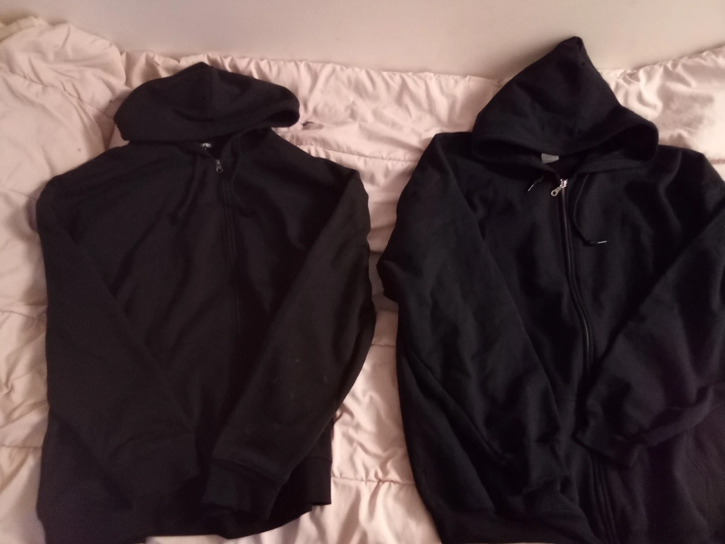 Two black zip-up hoodies. One is a George brand, size XL. The other is a Gildan Heavy Blend, size 3XL. Both are comfortable for everyday wear.