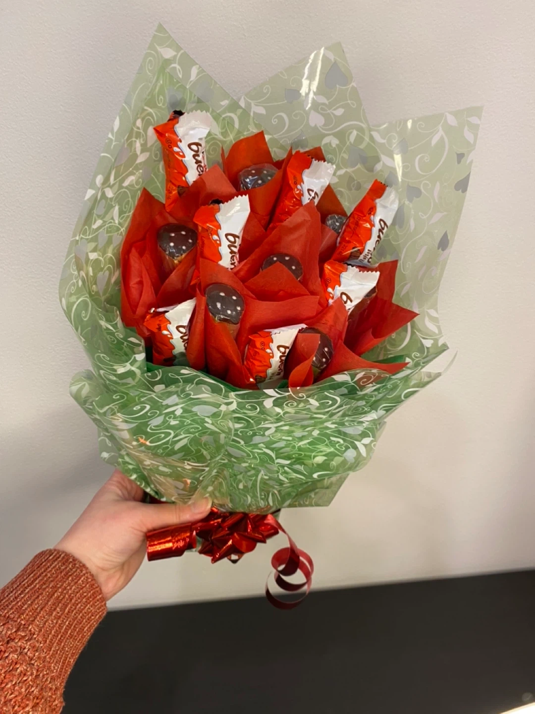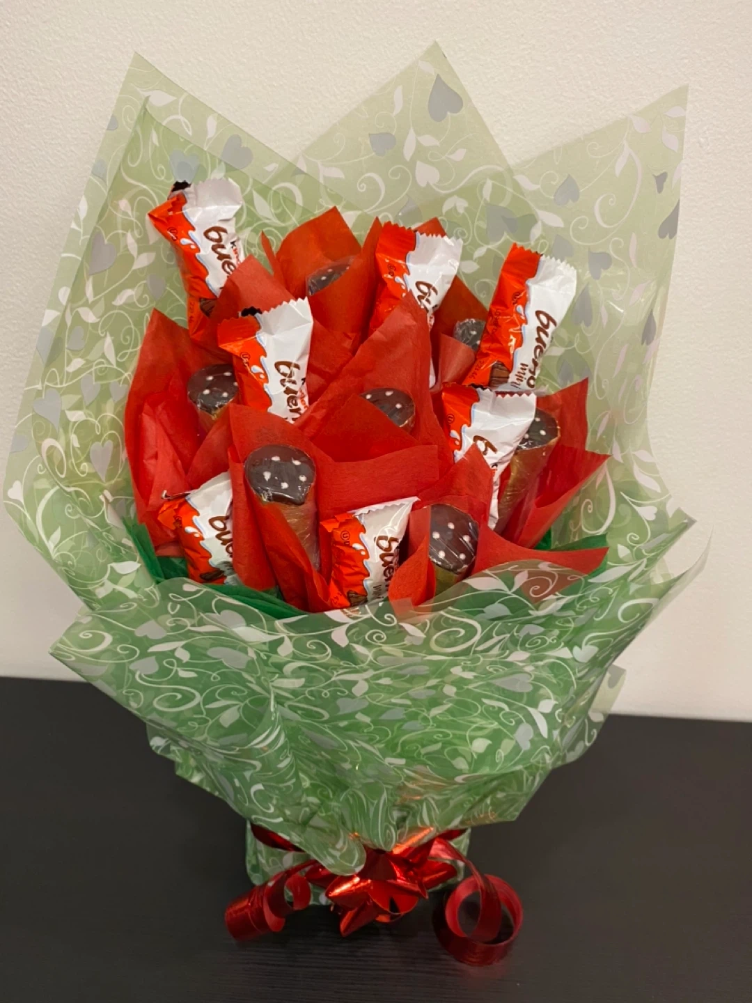 A thoughtful bouquet with several Kinder Bueno bars and individually wrapped Kinder chocolates. It is wrapped in green decorative paper with a red ribbon. This sweet arrangement will be a wonderful surprise for any chocolate lover!